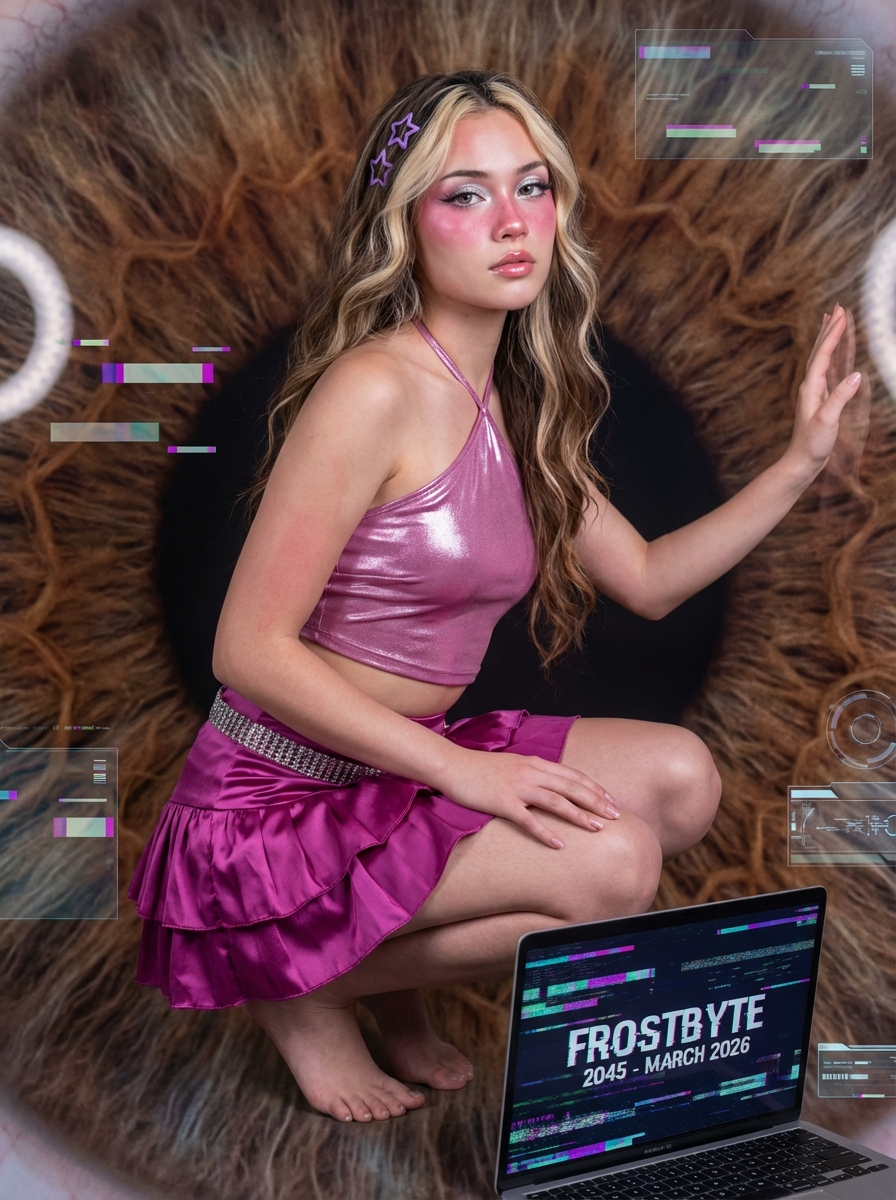 {"type": "image_prompt", "title": "Cyber Y2K Iris Editorial Portrait", "time_context": {"timezone": "UTC+7", "date": "31-12-2025"}, "identity_constraint": {"instruction": "Keep my facial features unchanged", "face_preservation": true}, "camera_and_lens": {"camera": "Sony A7R IV", "lens": "Sigma 35mm f/1.4 Art", "settings": {"aperture": "f/2.8", "shutter_speed": "1/160s", "iso": 200, "angle": "eye-level"}}, "style_and_mood": {"aesthetic": ["hyper-realistic", "surreal", "editorial", "cyber-Y2K"], "vibe": ["dreamy", "futuristic", "sci-fi"]}, "subject": {"description": "Young ", "pose": {"position": "crouching", "feet": "balancing on toes", "right_hand": "gently touching textured wall", "left_hand": "resting on knee"}, "expression": "calm, ethereal"}, "environment": {"scene": "Fantastical macro interior of a giant brown human iris", "details": ["extreme macro scale", "fibrous iris textures", "superimposed digital glitch rectangles", "sci-fi atmosphere"]}, "outfit_and_accessories": {"top": "shimmering metallic pink halter-neck crop top ", "skirt": "pleated satin magenta mini-skirt with ruffled tiers", "belt": "sparkling rhinestone belt"}, "hair_and_makeup": {"hair": {"style": "long loose waves", "highlights": "chunky blonde highlights framing the face", "accessories": "purple star-shaped hair clip s"}, "makeup": {"blush": "heavy pink blush across cheeks and nose (douyin style)", "eyeshadow": "shimmering silver", "eyeliner": "sharp winged", "lips": "glossy pink"}}, "foreground_element": {"object": "open laptop", "screen_content": "chaotic glitch-style digital code reading 'FROSTBYTE 2045 - March 2026'", "theme_function": "anchors tech-heavy narrative"}, "lighting": {"type": "soft studio-quality lighting", "details": ["visible circular catchlight reflection in background", "immersive and intimate illumination"]}, "render_quality": {"detail_level": "ultra-high detail", "realism": "photorealistic textures", "final_output": "editorial-grade image"}}
