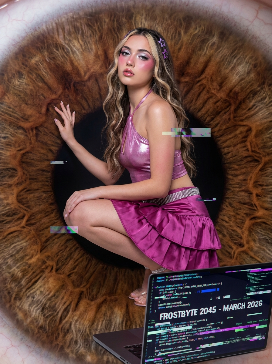 {"type": "image_prompt", "title": "Cyber Y2K Iris Editorial Portrait", "time_context": {"timezone": "UTC+7", "date": "31-12-2025"}, "identity_constraint": {"instruction": "Keep my facial features unchanged", "face_preservation": true}, "camera_and_lens": {"camera": "Sony A7R IV", "lens": "Sigma 35mm f/1.4 Art", "settings": {"aperture": "f/2.8", "shutter_speed": "1/160s", "iso": 200, "angle": "eye-level"}}, "style_and_mood": {"aesthetic": ["hyper-realistic", "surreal", "editorial", "cyber-Y2K"], "vibe": ["dreamy", "futuristic", "sci-fi"]}, "subject": {"description": "Young ", "pose": {"position": "crouching", "feet": "balancing on toes", "right_hand": "gently touching textured wall", "left_hand": "resting on knee"}, "expression": "calm, ethereal"}, "environment": {"scene": "Fantastical macro interior of a giant brown human iris", "details": ["extreme macro scale", "fibrous iris textures", "superimposed digital glitch rectangles", "sci-fi atmosphere"]}, "outfit_and_accessories": {"top": "shimmering metallic pink halter-neck crop top ", "skirt": "pleated satin magenta mini-skirt with ruffled tiers", "belt": "sparkling rhinestone belt"}, "hair_and_makeup": {"hair": {"style": "long loose waves", "highlights": "chunky blonde highlights framing the face", "accessories": "purple star-shaped hair clip s"}, "makeup": {"blush": "heavy pink blush across cheeks and nose (douyin style)", "eyeshadow": "shimmering silver", "eyeliner": "sharp winged", "lips": "glossy pink"}}, "foreground_element": {"object": "open laptop", "screen_content": "chaotic glitch-style digital code reading 'FROSTBYTE 2045 - March 2026'", "theme_function": "anchors tech-heavy narrative"}, "lighting": {"type": "soft studio-quality lighting", "details": ["visible circular catchlight reflection in background", "immersive and intimate illumination"]}, "render_quality": {"detail_level": "ultra-high detail", "realism": "photorealistic textures", "final_output": "editorial-grade image"}}