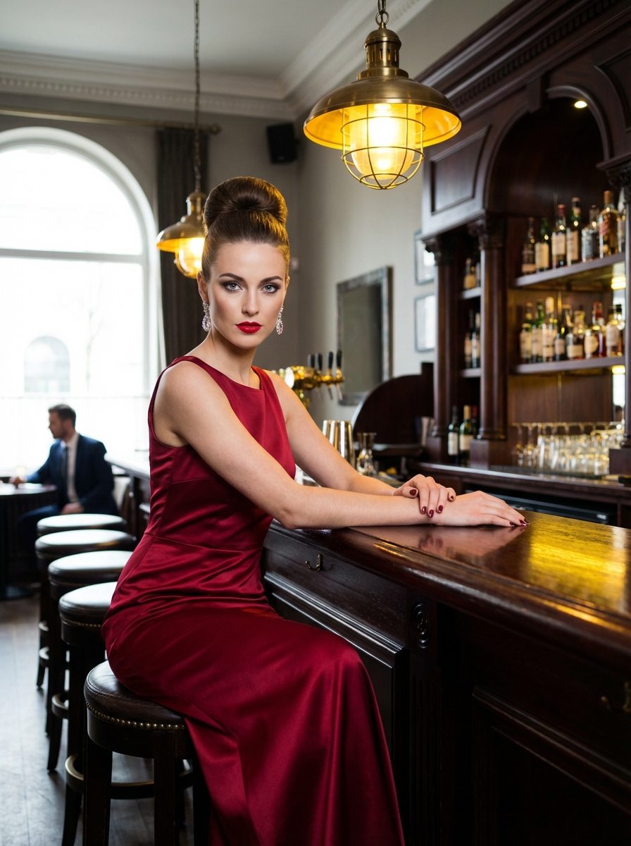 {"type": "nano_banana_photorealistic_editing_prompt", "resolution": "8K", "style": "editorial fashion photography, cinematic, hyper-photorealistic", "identity_preservation": {"use_face_source_image": true, "alter_face": false, "priority": "MANDATORY", "notes": "The subject’s facial identity, structure, proportions, and expression must be rendered identically to the source image. This is non-negotiable."}, "subject": {"gender": "model", "role": "high-fashion model", "appearance": {"eyes": "striking light eyes", "hair": {hair, "style": "severe, elegant high updo"}, "expression": "intensely direct, confident, provocative", if(gender=f){"makeup": {"eyes": "precise dark eye makeup", "lips": "vivid red lipstick} "}, "body_shape": "hourglass figure with narrow waist and wider hips", "accessories": ["sparkling crystal if(gender=f){drop earrings } "]}}, "wardrobe": {"dress": {"type": "full-length evening gown ", "material": "deep crimson satin", "design": ["strapless with sweetheart neckline", "elegant fitted bodice", "flowing full-length skirt with subtle asymmetrical draping", "luxurious sheen with visible satin texture"], "fit": "body-hugging through the torso, flowing gracefully from the hips downward"}, "footwear": {"type": "pointed-toe stiletto pumps ", "color": "matching crimson"}}, "pose": {"position": "seated", "seat": "tall leather-padded bar stool with dark metal frame", "body_angle": "slightly angled to the right", "gaze": "locked directly onto the camera", "legs": {"position": "crossed at the ankles beneath the gown ", "effect": "maintains elegance while preserving the full-length dress silhouette"}, "arms": "forearms resting casually on the polished bar counter"}, "environment": {"location": "luxurious vintage-style interior bar", "interior_details": ["dark polished mahogany bar counter", "ornate dark wood paneling", "tiered shelves densely stocked with liquor bottles and glassware"], "background_elements": {"window": "large arched window with soft diffused ambient light and warm-toned blurred exterior", "secondary_subject": "model in dark suit seated at a nearby table, facing away, softly out of focus", "floor": "dark stone-gray patterned tiles"}}, "lighting": {"key_light": {"source": "antique brass-caged pendant lamp above subject", "quality": "intense warm yellow-incandescent glow", "effects": ["specular highlights on skin", "strong reflections on satin dress", "glossy reflections on bar surface"]}, "ambient_light": {"source": "arched window", "tone": "soft, cool-toned fill"}, "contrast": "high-contrast fashion lighting with deep shadows"}, "camera": {"shot_type": "low-angle medium-long shot", "camera_system": "medium format camera", "depth_of_field": "very shallow", "focus": "razor-sharp focus on the model", "bokeh": "smooth, creamy background blur"}, "color_grading": {"style": "cinematic", "palette": ["deep crimson", "warm gold highlights", "rich browns", "cool shadow tones"], "contrast": "rich and dramatic"}, "quality_requirements": {"photorealism": "hyper-realistic", "textures": ["high-fidelity skin texture", "detailed satin fabric reflections", "realistic lighting and shadows"], "proportions": "perfect head-to-body proportions", "artifacts": "no signatures, no watermarks"}, "output_goal": "Render a hyper-realistic, high-fashion editorial portrait of a model seated at a luxury bar, wearing a full-length crimson."}