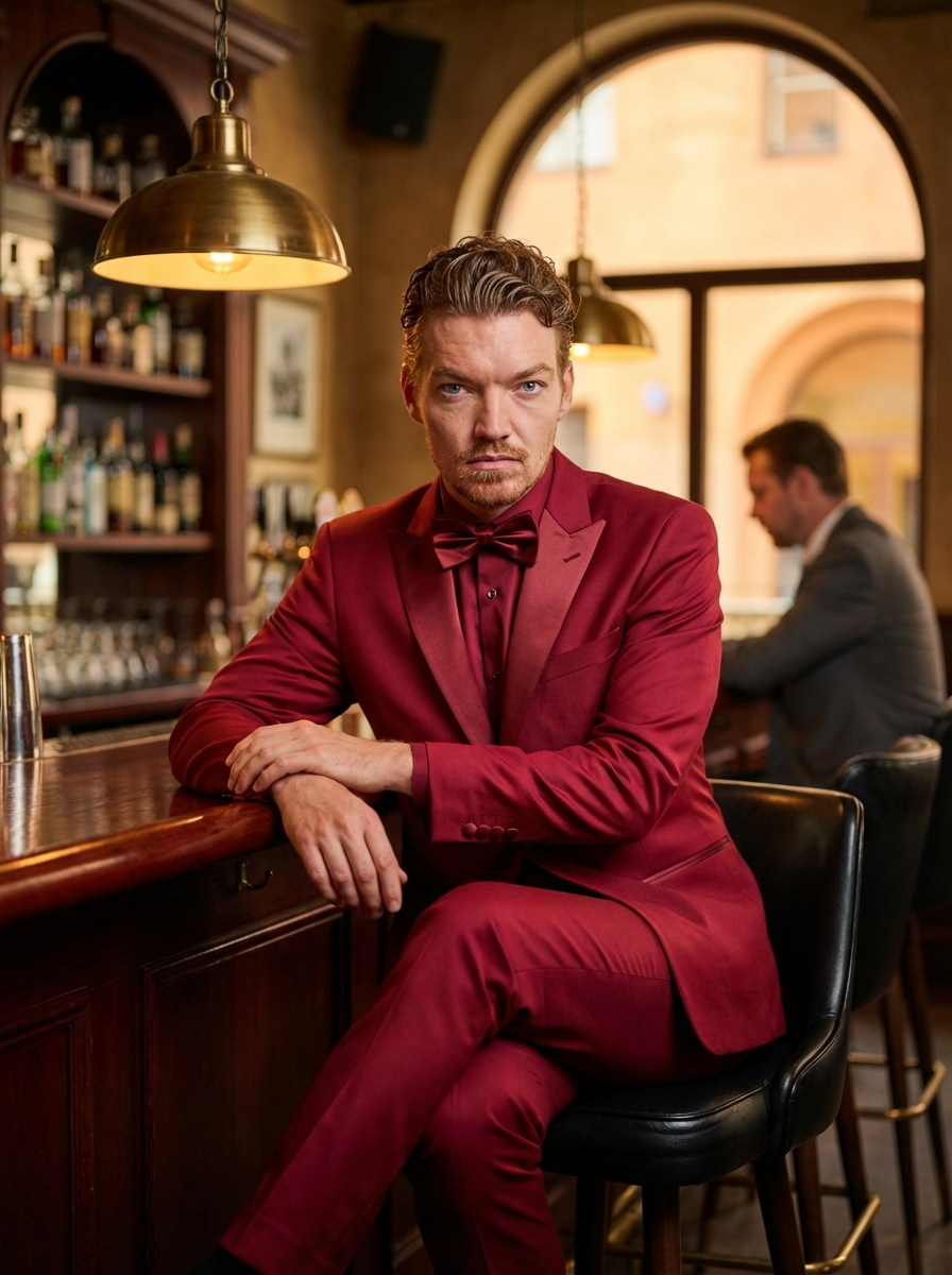 {"type": "nano_banana_photorealistic_editing_prompt", "resolution": "8K", "style": "editorial fashion photography, cinematic, hyper-photorealistic", "identity_preservation": {"use_face_source_image": true, "alter_face": false, "priority": "MANDATORY", "notes": "The subject’s facial identity, structure, proportions, and expression must be rendered identically to the source image. This is non-negotiable."}, "subject": {"gender": "female", "role": "high-fashion model", "appearance": {"eyes": "striking light eyes", "hair": {"color": "dark", "style": "severe, elegant high updo "}, "expression": "intensely direct, confident, provocative", "makeup": {"eyes": "precise dark eye makeup ", "lips": "vivid red lipstick "}, "body_shape": "hourglass figure with narrow waist and wider hips ", "accessories": ["sparkling crystal drop earrings "]}}, "wardrobe": {"dress": {"type": "full-length evening gown ", "material": "deep crimson satin", "design": ["strapless with sweetheart neckline ", "elegant fitted bodice", "flowing full-length skirt with subtle asymmetrical draping ", "luxurious sheen with visible satin texture"], "fit": "body-hugging through the torso, flowing gracefully from the hips downward"}, "footwear": {"type": "pointed-toe stiletto pumps ", "color": "matching crimson"}}, "pose": {"position": "seated", "seat": "tall black leather-padded bar stool with dark metal frame", "body_angle": "slightly angled to the right", "gaze": "locked directly onto the camera", "legs": {"position": "crossed at the ankles beneath the gown ", "effect": "maintains elegance while preserving the full-length dress silhouette"}, "arms": "forearms resting casually on the polished bar counter"}, "environment": {"location": "luxurious vintage-style interior bar", "interior_details": ["dark polished mahogany bar counter", "ornate dark wood paneling", "tiered shelves densely stocked with liquor bottles and glassware"], "background_elements": {"window": "large arched window with soft diffused ambient light and warm-toned blurred exterior", "secondary_subject": "model in dark suit seated at a nearby table, facing away, softly out of focus", "floor": "dark stone-gray patterned tiles"}}, "lighting": {"key_light": {"source": "antique brass-caged pendant lamp above subject", "quality": "intense warm yellow-white incandescent glow", "effects": ["specular highlights on skin", "strong reflections on satin dress", "glossy reflections on bar surface"]}, "ambient_light": {"source": "arched window", "tone": "soft, cool-toned fill"}, "contrast": "high-contrast fashion lighting with deep shadows"}, "camera": {"shot_type": "low-angle medium-long shot", "camera_system": "medium format camera", "depth_of_field": "very shallow", "focus": "razor-sharp focus on the model", "bokeh": "smooth, creamy background blur"}, "color_grading": {"style": "cinematic", "palette": ["deep crimson", "warm gold highlights", "rich browns", "cool shadow tones"], "contrast": "rich and dramatic"}, "quality_requirements": {"photorealism": "hyper-realistic", "textures": ["high-fidelity skin texture", "detailed satin fabric reflections", "realistic lighting and shadows"], "proportions": "perfect head-to-body proportions", "artifacts": "no signatures, no watermarks"}, "output_goal": "Render a hyper-realistic, high-fashion editorial portrait of a model seated at a luxury bar, wearing a full-length crimson gown ."}