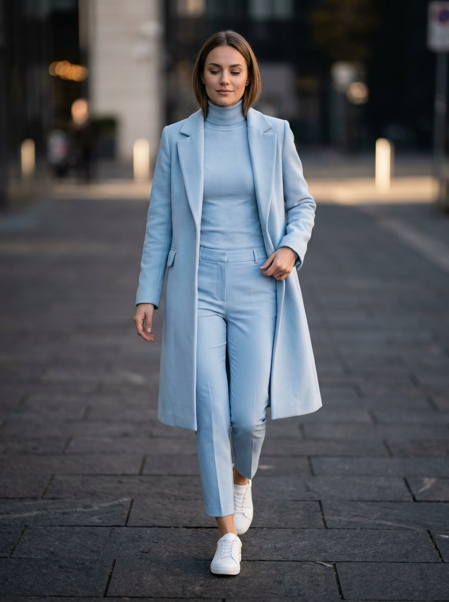 {"type":"image_generation_prompt","aspect_ratio":"9:16","resolution":"1080x1920","style":"cinematic, minimalistic, modern, classy street-style","identity_preservation":{"use_reference_image":true,"strict_identity_lock":true,"alter_face":false,"notes":"The face must remain 100% identical to the uploaded reference image, with no changes to facial structure, proportions, expression, skin texture, or identity."},"subject":{"gender":"female","pose":{"action":"walking forward confidently","legs":"right leg stepping ahead, left leg slightly behind in a natural walking motion","arms":{"left_hand":"swinging loosely by her side","right_hand":"bent, lightly touching the edge of her pants pocket"},"head":"slightly tilted to the left","gaze":"eyes softly directed downward"},"expression":"calm, confident, self-assured","outfit":{"coat":"pastel blue long coat with a structured, elegant fit","top":"fitted pastel blue turtleneck","trousers":"slim-cut, slightly cropped pastel blue trousers","shoes":"clean white sneakers"}},"environment":{"location":"dark stone pavement","mood":"refined, modern, confident","style":"urban, minimal, elegant"},"lighting":{"type":"soft, warm lighting","purpose":"enhance depth and texture of clothing and stone pavement","effects":["realistic shadows","natural highlights","cinematic depth"]},"camera":{"angle":"eye-level","position":"directly in front of the subject","lens_simulation":"85mm portrait lens","depth_of_field":"realistic with subtle foreground blur and bokeh","compression":"cinematic"},"quality":{"realism":"ultra-photorealistic","detail":"high detail in fabric texture, pavement, and skin","artifacts":"none"},"constraints":["No facial alteration","No beautification or retouching","No distortion or stylization","Preserve natural proportions and realism"],"output_goal":"Create a vertical, cinematic full-body portrait of a confident model walking forward on dark stone pavement, wearing a pastel blue minimalist outfit, with soft warm lighting and an elegant, modern street-style aesthetic, while preserving her face with 100% accuracy from the reference image."}