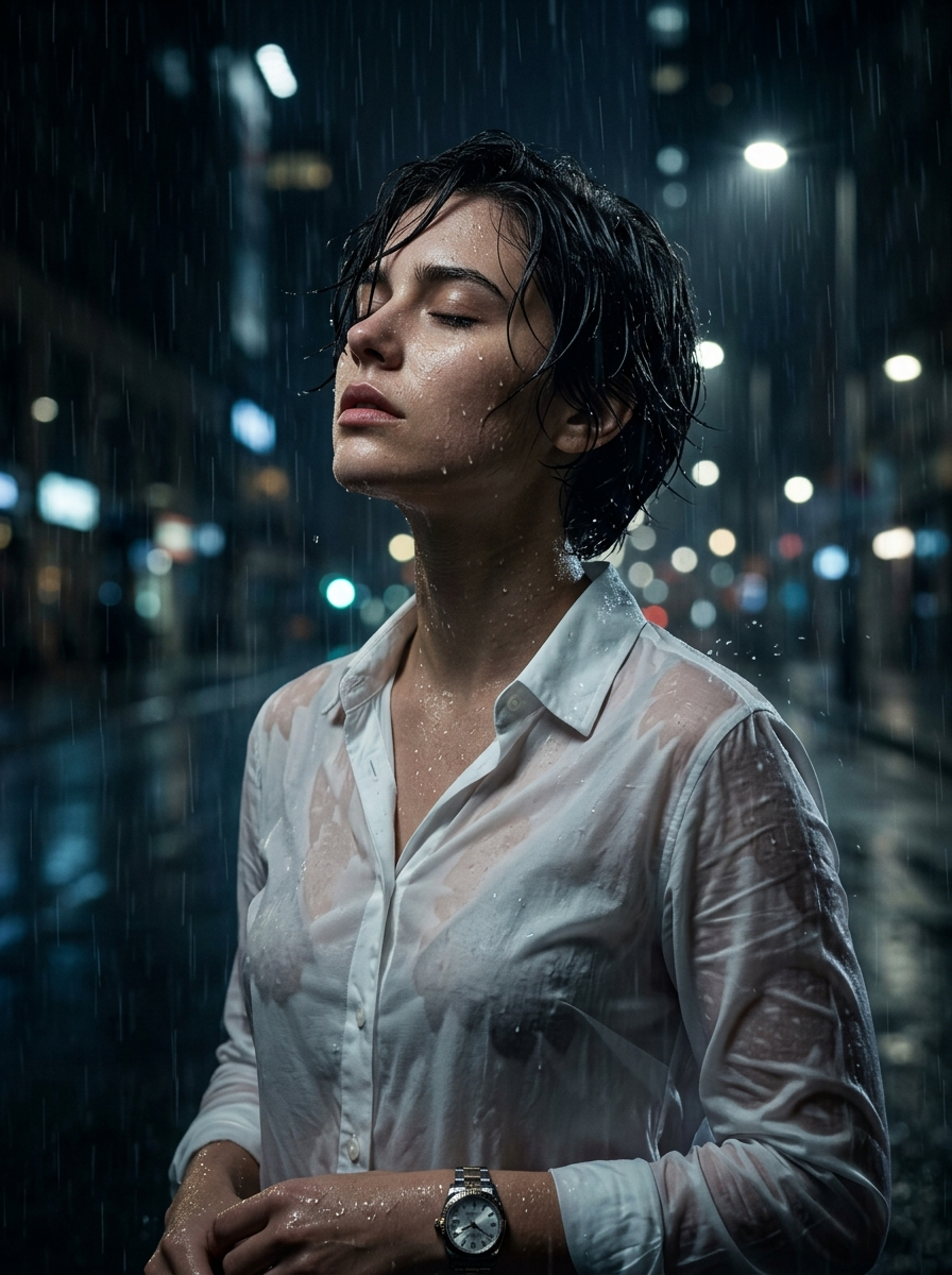 {"type":"image_generation_prompt","aspect_ratio":"9:16","style":"hyper-realistic cinematic night portrait","identity_preservation":{"use_reference_image":true,"strict_identity_lock":true,"alter_face":false,"alter_hair":false,"notes":"Preserve 100% of the subject\u2019s face, facial structure, proportions, skin texture, and hairstyle exactly as in the reference image."},"subject":{"gender":"female","pose":{"position":"standing outdoors in the rain at night","head":"tilted slightly upward","gaze":"looking upward, feeling the rain"},"expression":"intense, emotional, contemplative","appearance":{"hair":{"state":" and tousled","notes":"Hair must remain identical to the reference image, only affected naturally by rain"},"skin":{"details":["raindrops glistening on the face","natural skin texture","no smoothing or beautification"]}},"wardrobe":{"top":"soaked white button-up shirt clinging naturally to the body","accessories":["luxury wristwatch on the wrist"]}},"environment":{"setting":"outdoor urban environment at night","weather":"heavy rain","atmosphere":"moody, dramatic, cinematic"},"lighting":{"style":"dramatic low-key lighting","features":["deep shadows","strong highlights on water droplets","cinematic contrast"]},"visual_effects":{"rain":"water droplets frozen in motion","motion":"subtle rain streaks ","depth":"cinematic depth of field"},"camera":{"shot_type":"portrait","angle":"eye-level to slightly low","focus":"sharp focus on face and upper body","look":"professional photography style"},"quality":{"resolution":"high resolution","realism":"ultra-photorealistic","detail_level":"extreme detail in skin, fabric, water, and lighting"},"constraints":["Do not alter face or hair","No artificial filters","No cartoon or stylized effects","No distorted anatomy","No text or watermarks"],"output_goal":"Create a hyper-realistic cinematic night portrait of a model standing in the rain, preserving her exact facial identity and hairstyle, with dramatic lighting, rain droplets, and an intense emotional atmosphere."}