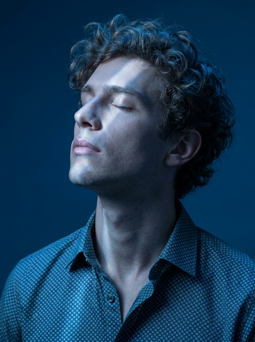 {"type":"image_generation_prompt","concept":{"description":"An artistic editorial close-profile portrait of a young male model, immersed in dramatic blue lighting. His eyes are closed, with his head gently tilted upward, expressing serenity and introspection. A diagonal beam of cold light crosses his face, illuminating his eyes, nose, and lips with precise intensity. A solid deep blue background enhances the ethereal, emotional aesthetic.","mood":"quiet, introspective, ethereal","color_theme":"deep blue with cold highlights"},"subject":{"gender":"male model","identity_preservation":{"use_reference_image":true,"alter_face":false,"notes":"Maintain the subject\u2019s exact facial features, structure, skin tone, and identity from the uploaded image."},"pose":{"name":"Blue Profile","head_position":"slightly tilted upward","eyes":"closed","expression":"serene and introspective","highlight":"diagonal beam of light crossing the face, enhancing facial contours"},"appearance":{"hair":{"style":"curly, textured, voluminous","lighting_effect":"subtle blue reflections"},"clothing":{"shirt":"petroleum-blue shirt with light gray micro-geometric print","fabric":"lightweight material with soft shine under direct light","collar":"traditional, top button open to reveal part of the neck","details":{"cuffs":"adjusted cuffs","stitching":" dark blue stitching","fit":"elegant and modern"}},"accessories":"none "}},"camera_settings":{"camera":"Canon EOS R5","lens":"85mm f\/1.4","aperture":"f\/2.2","iso":320,"shutter_speed":"1\/200s","framing":"close-up profile, vertical 4:5 format","resolution":"Ultra-HD 8K","focus":"absolute focus on the face, capturing skin texture, hair, and light transitions"},"lighting":{"type":"dramatic cold diagonal beam","background":"deep solid blue","effects":["precise illumination on eyes, nose, and mouth","soft enhancement of facial contours","editorial contrast and silence-like aesthetic"]},"visual_style":{"genre":"artistic editorial portrait","contrast_level":"medium-high","tone":"cold, atmospheric","keywords":["cinematic","high-fashion","introspective","ethereal"]},"output_goal":"Create an ultra-realistic editorial portrait of a young male model in dramatic blue lighting, preserving his identity while capturing a serene, introspective moment in close-profile composition."}
