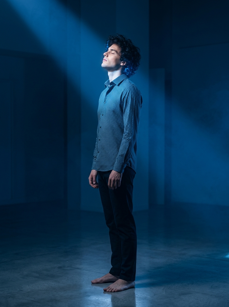 {"type":"image_generation_prompt","concept":{"description":"An artistic editorial close-profile portrait of a young male model, immersed in dramatic blue lighting. His eyes are closed, with his head tilted upward, expressing serenity and introspection.","mood":"quiet, introspective, ethereal","color_theme":"deep blue with cold highlights"},"subject":{"gender":"male model","identity_preservation":{"use_reference_image":true,"alter_face":false,"notes":"Maintain the subject\u2019s exact facial features, structure, skin tone, and identity from the uploaded image."},"pose":{"name":"Blue Profile","head_position":"tilted upward","eyes":"closed","expression":"serene and introspective","highlight":"diagonal beam of light crossing the face, enhancing facial contours"},"appearance":{"hair":{"style":"short curly, voluminous, well-defined","lighting_effect":"subtle blue reflections"},"clothing":{"shirt":"petroleum-blue shirt with light gray micro-geometric print","fabric":"lightweight material with soft shine under direct light","collar":"traditional, top button open to reveal part of the neck","details":{"cuffs":"adjusted cuffs","stitching":" dark blue stitching","fit":"tailored and modern"}},"accessories":"none "}},"camera_settings":{"camera":"Canon EOS R5","lens":"85mm f\/1.4","aperture":"f\/2.2","iso":320,"shutter_speed":"1\/200s","framing":"close-up profile, vertical 4:5 format","resolution":"Ultra-HD 8K","focus":"absolute focus on the face, capturing skin texture, hair, and light transitions"},"lighting":{"type":"dramatic cold diagonal beam","background":"deep solid blue","effects":["precise illumination on eyes, nose, and mouth","soft enhancement of facial contours","editorial contrast and silence-like aesthetic"]},"visual_style":{"genre":"artistic editorial portrait","contrast_level":"medium-high","tone":"cold, atmospheric","keywords":["cinematic","high-fashion","introspective","ethereal"]},"output_goal":"Create an ultra-realistic editorial portrait of a young male model in dramatic blue lighting, preserving his identity while capturing a serene, introspective moment in close-profile composition."}