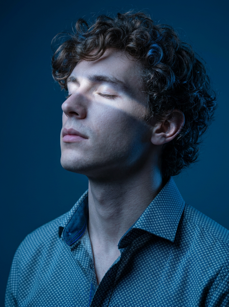 {"type":"image_generation_prompt","concept":{"description":"An artistic editorial close-profile portrait of a young male model, immersed in dramatic blue lighting. His eyes are closed, with his head gently tilted upward, expressing serenity and introspection.","mood":"quiet, introspective, ethereal","color_theme":"deep blue with cold highlights"},"subject":{"gender":"male model","identity_preservation":{"use_reference_image":true,"alter_face":false,"notes":"Maintain the subject\u2019s exact facial features, structure, skin tone, and identity from the uploaded image."},"pose":{"name":"Blue Profile","head_position":"slightly tilted upward","eyes":"closed","expression":"serene and introspective","highlight":"diagonal beam of light crossing the face, enhancing facial contours"},"appearance":{"hair":{"style":"curly, voluminous, well-defined","lighting_effect":"subtle blue reflections"},"clothing":{"shirt":"petroleum-blue shirt with light gray micro-geometric print","fabric":"lightweight material with soft shine under direct light","collar":"traditional, top button open to reveal part of the neck","details":{"cuffs":"adjusted cuffs","stitching":" dark blue stitching","fit":"elegant and modern"}},"accessories":"none "}},"camera_settings":{"camera":"Canon EOS R5","lens":"85mm f\/1.4","aperture":"f\/2.2","iso":320,"shutter_speed":"1\/200s","framing":"close-up profile, vertical 4:5 format","resolution":"Ultra-HD 8K","focus":"absolute focus on the face, capturing skin texture, hair, and light transitions"},"lighting":{"type":"dramatic cold diagonal beam","background":"deep solid blue","effects":["precise illumination on eyes, nose, and mouth","soft enhancement of facial contours","editorial contrast and silence-like aesthetic"]},"visual_style":{"genre":"artistic editorial portrait","contrast_level":"medium-high","tone":"cold, atmospheric","keywords":["cinematic","high-fashion","introspective","ethereal"]},"output_goal":"Create an ultra-realistic editorial portrait of a young male model in dramatic blue lighting, preserving his identity while capturing a serene, introspective moment in close-profile composition."}