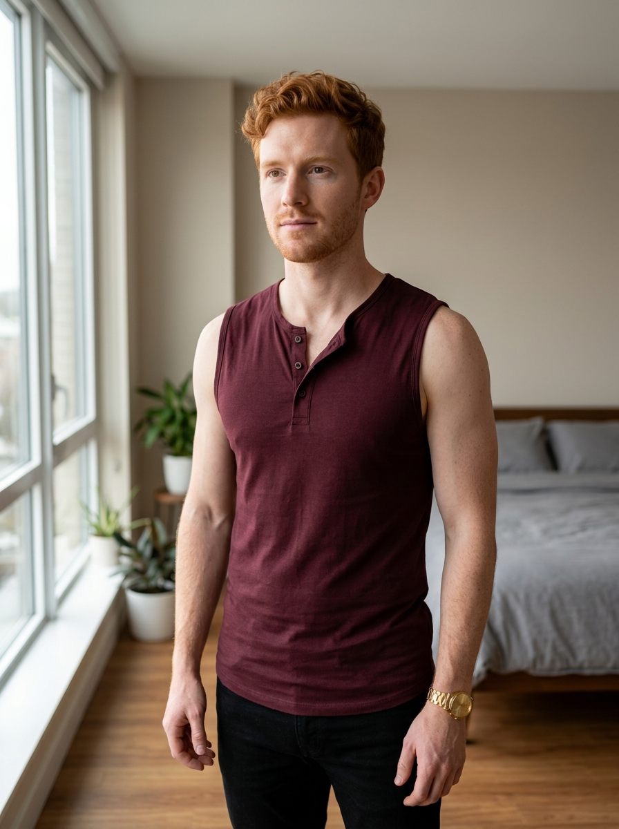 {"type":"image_generation","style":"ultra_photorealistic","aspect_ratio":"4:5","resolution":"8K","layout":{"type":"2x4 grid collage","consistency":"same model across all frames","variation":"different angles, poses, and close-ups"},"subject":{"gender":"male","age":"mid 20s","skin_tone":"fair with natural texture","hair":{"color":"rich copper red","style":"short tousled waves","shine":"natural healthy gloss"},"expression":"calm, confident, candid","makeup":"clean groomed skin, light stubble, natural features"},"outfit":{"top":"deep maroon fitted sleeveless henley shirt","fabric":"matte cotton","fit":"tailored and athletic"},"accessories":{"wristwatch":"gold sunburst design wristwatch","beauty_items":["cologne bottle","aftershave balm","grooming brush","smartphone"]},"scenes":["model spraying cologne in front of a modern LED mirror","flat lay of grooming products on marble surface","close-up of wristwatch on wrist","side profile portrait with soft window light","back view showing hair texture","full-body portrait near large window","relaxed candid pose touching hair","product shot of wristwatch on beige silk fabric"],"lighting":{"type":"natural window light","quality":"soft, diffused, realistic shadows","time":"daytime"},"camera":{"lens":"50mm DSLR","depth_of_field":"shallow","focus":"sharp subject, creamy background blur"},"environment":{"location":"modern minimal bedroom","colors":"neutral beige, warm wood tones","mood":"clean, elegant, lifestyle editorial"},"quality_controls":{"skin_detail":" pores, realistic texture","no_filters":true,"no_ai_artifacts":true},"negative_prompt":["cartoon","illustration","over-smoothed skin","plastic look","extra fingers","distorted face","blur","low resolution","watermark","text"]}