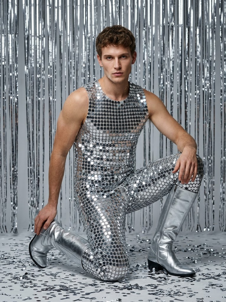 {"type":"image_prompt","reference":"Use facial features of the attached photo","subject":{"description":"Ultra-realistic high-fashion editorial portrait of a handsome adult male model posed in a studio celebration setting"},"hair":{"length":"short","texture":"wavy","style":"voluminous textured crop with deep side part","finish":"natural glossy","placement":"framing the face and neck"},"grooming":{"style":"clean natural look","eyes":"natural features","brows":"defined","contour":"natural features","skin":"natural glow with light stubble","lips":"neutral"},"clothing":{"dress":{"type":"sleeveless body-hugging fitted shirt and trousers","material":"reflective silver circular disc sequins","pattern":"dense uniform arrangement","neckline":"high round neckline","fit":"fitted silhouette","hemline":"shirt at waist, trousers full tailored length","logos":"none"},"boots":{"type":"metallic silver knee-high boots","finish":"soft textured sheen","fit":"snug over the calves","logos":"none"}},"pose_composition":{"pose":"kneeling confidently on the floor with knees apart and feet planted firmly beneath","hands":"placed on the ground for balance"," ":"leaning slightly forward","shoulders":"broad and relaxed","gaze":"direct gaze toward the camera","framing":"three-quarter body framing"},"environment_background":{"setting":"clean studio celebration setup","backdrop":"cascading vertical silver foil streamers forming a shimmering curtain","floor":"scattered silver confetti with reflective textures"},"lighting":{"key_light":"soft key light illuminating face and outfit","fill_light":"even fill light maintaining sequin detail","rim_light":"subtle rim light separating hair and shoulders from background","highlights":"crisp","shadows":"realistic","effects":"no glow haze"},"style_quality":{"photography":"photorealistic fashion photography","detail":"high-detail textures and natural proportions","exclusions":["anime","illustration","CGI","3D rendering"]},"camera_technical":{"camera":"full-frame DSLR or mirrorless","lens":"70\u201385mm","aperture":"f\/4","iso":100,"shutter_speed":"1\/160s","focus":"sharp focus on subject","depth_of_field":"balanced","reflections":"accurate metallic reflections"},"aspect_ratio":"2:3 vertical"}