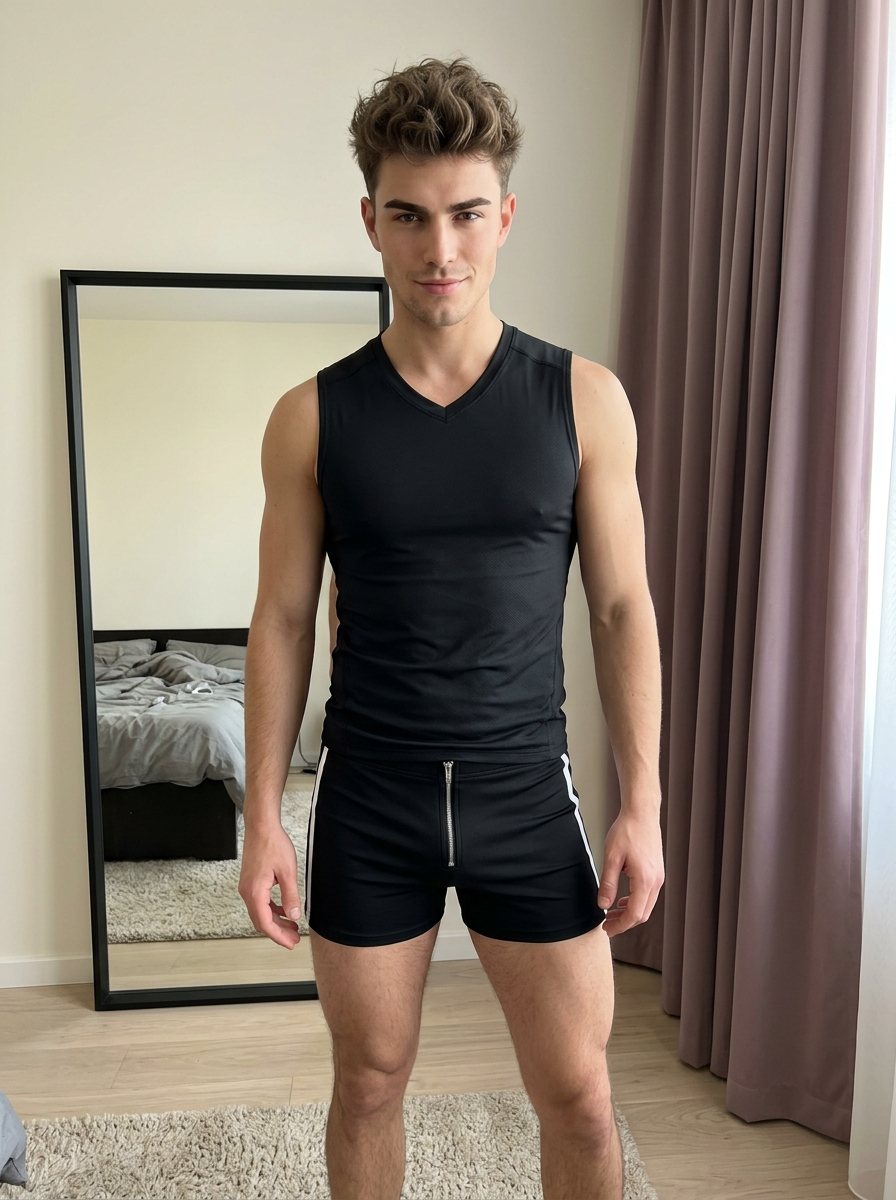 {"type":"Ultra Photorealistic Portrait","subject":{"demographics":"Young model, approx 20-25 years old","physique":"Slim, toned, athletic build","skin":"Pale, smooth texture","hair":{"style":"Short, voluminous, tousled textured cut","texture":"Silky, high-shine"},"grooming":"clean natural look, natural features","eyes":"natural features, natural lashes","brows":"Well-groomed, dark brows"},"attire":{"top":"sleeveless V-neck fitted t-shirt\/fitted athletic top, fitted fabric","bottom":"fitted shorts with vertical side stripes and a central silver zipper closure","accessories":"","styling":"Casual chic, athleisure, influencer aesthetic"},"pose":{"stance":"Standing upright, facing forward, relaxed weight shift to the left","arms":"Relaxed at sides, hands near ","expression":"Subtle, confident smirk; direct engagement with the camera","angle":"Eye-level, medium shot (knees up)"},"environment":{"setting":"Bedroom interior","background_elements":["Large black-framed floor mirror leaning against a cream wall","Reflection in mirror showing a bed with messy grey duvet\/sheets","Floor-to-ceiling dusty mauve\/purple curtains on the right","Light beige wood flooring"," area rug on the floor"]},"lighting":{"source":"Soft, diffused natural window light coming from the front\/right","characteristics":"Even illumination on the face, soft minimal shadows, no harsh highlights"},"mood":"Casual, confident, stylish, contemporary","camera_technical":{"style":"Raw photography, social media portraiture","camera_man":"Sony A7R IV or Canon EOS R5","lens":"50mm f\/1.8 Prime Lens","settings":{"aperture":"f\/2.8 (sharp subject, slightly soft background)","iso":"100","shutter_speed":"1\/125"},"quality_tags":["8k resolution","Hyper-realistic skin texture","Detailed fabric weave","Volumetric lighting","Depth of field","HDR","Unreal Engine 5 render style"]}}