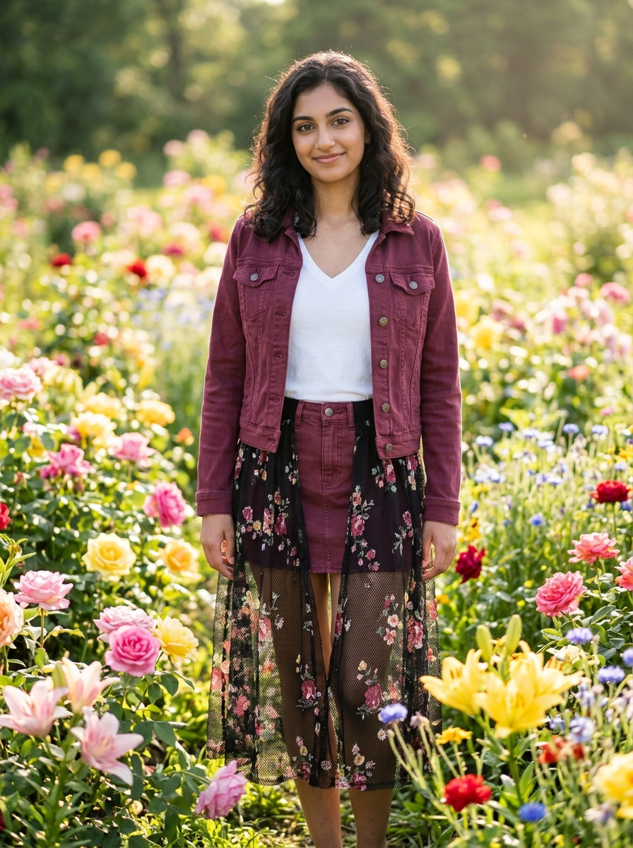 Ultra-detailed 8K portrait of graceful 21 years young Beautiful women in vibrant flower field mixing roses,lilies,and wildflowers,wearing trendy White colour V neck with Black Colour midi skirt colourfull Flowers in netted midi skirt,and Add Maroon Colour Jeans mini jacket,soft diffused lighting,hyper-realistic skin details,professional photography quality,multiple color variations of blooms,romantic dreamy atmosphere,photorealistic texture rendering,natural.
