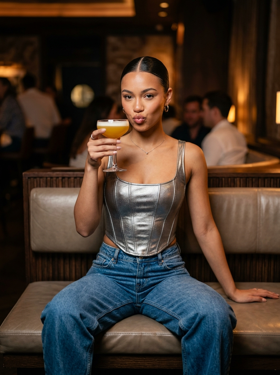 Ultra photorealistic lifestyle portrait of a young model sitting inside a dimly lit upscale restaurant or cocktail bar. Scene is indoors at night. Subject is seated on a cushioned booth bench. Her legs are relaxed and slightly apart, feet planted on the floor, body posture confident and casual. Torso facing the camera directly. Camera angle is slightly above eye level, tilted downward about 10–15 degrees. Framing is medium-full body, from head to upper thighs. Subject occupies the center of the frame.\n\nHer right arm is raised and bent at the elbow, holding a coupe cocktail glass close to her face, glass tilted slightly toward the camera as if toasting. The cocktail is yellow-orange with a smooth foamy top. Fingers are elegantly wrapped around the stem of the glass. Left arm rests casually near her hip or on the bench.\n\nFacial expression is playful and confident with slightly puckered lips (soft pout). Head tilted subtly to the left. Eyes looking directly into the camera. Hair is slicked back tightly into a clean low bun with a precise center part, no loose strands.\n\nShe is wearing a metallic silver sleeveless corset-style top with vertical seam lines, structured fit, square neckline. Bottom is high-waisted loose blue jeans with a fabric tie detail at the waist. Outfit reflects soft ambient light with subtle sheen.\n\nJewelry is minimal: small if(gender=f){hoop earrings } , delicate thin necklace. Makeup is soft glam : natural skin texture visible, subtle blush , glossy lips , lightly contour ed cheeks, defined eyebrows, soft highlight on cheekbones.\n\nLighting is warm cinematic restaurant lighting. Key light is soft and frontal-left, simulating ambient bar lighting. Fill light is minimal, preserving natural shadows. Subtle rim light from behind creates gentle separation from background. No harsh flash. Skin highlights are smooth and realistic.\n\nBackground is softly blurred (shallow depth of field) with indistinct figures of other people sitting and standing behind her, warm bokeh lights, dark wood and glass textures. Atmosphere feels intimate, stylish, and social.\n\nPhotography style: ultra realistic, DSLR quality, natural proportions, accurate skin tones, high detail. No stylization, no illustration look.\n\nNegative constraints: no text, no subtitles, no captions, no logos, no watermarks, no social media UI, no advertisements, no filters, no beauty distortion, no over-smoothing.