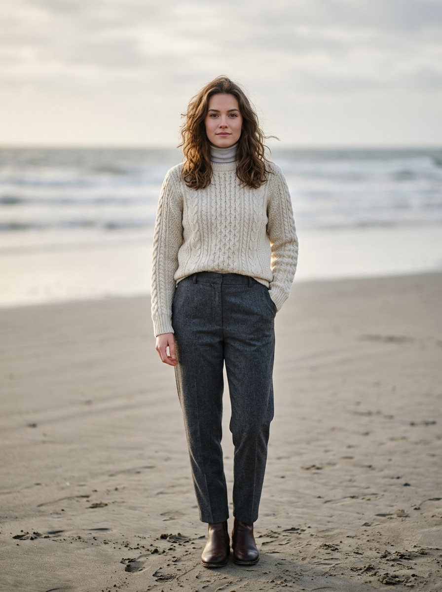 Ultra-realistic cinematic photoshoot of a girl (same look as reference), standing on a cold winter beach. Soft golden winter light, lightly overcast sky, natural tones. She is wearing an attractive but not-too-heavy outfit โ stylish coat or knit sweater, layered yet elegant, flowing hair. Subject is sharply in focus, eyes clear and expressive. Background is beach waves and horizon but fully blurred with shallow depth of field (bokeh). Composition centered, portrait framing, soft wind effect, subtle motion, professional lens, high detail skin, natural color grading, no harsh shadows, premium magazine style. Camera: 85mm, f/1.8, ISO 200, shallow DOF Lighting: soft diffused key light, gentle rim light Quality: 8k, high-detail, photorealistic, cinematic, crisp focus Mood: calm, cold, serene, confident pose No distortion, no busy background, no heavy clothing, no artifacts, no oversharpening