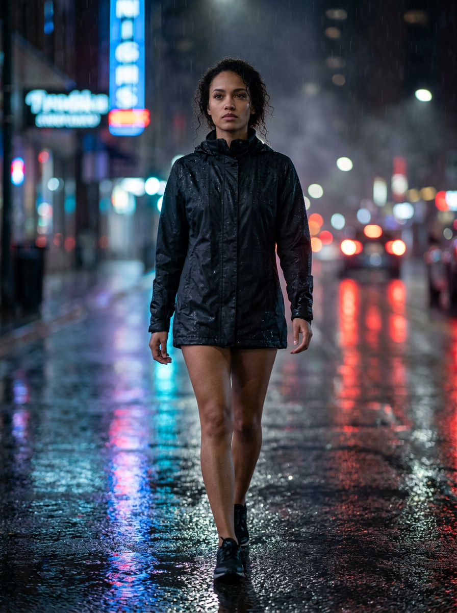 Ultra-realistic cinematic portrait of a model (same face, hairstyle, and overall appearance as reference image), walking through a rainy city street at night. Neon sign lights reflect across asphalt and puddles, creating shimmering colors. Raindrops bead on her jacket and subtle droplets cling to loose hair strands. She has a calm but moody expression, eyes slightly thoughtful as she looks ahead. Background is softly blurred with beautiful bokeh lights from traffic and storefronts. Film-like atmosphere with blue and red neon contrast, soft rim lighting on her shoulders, and light mist in the air. Dynamic street reflections, shallow depth of field, detailed skin texture, realistic fabric, natural posture, cinematic composition, 85mm lens look, volumetric light, high resolution, photoreal, studio-grade quality.