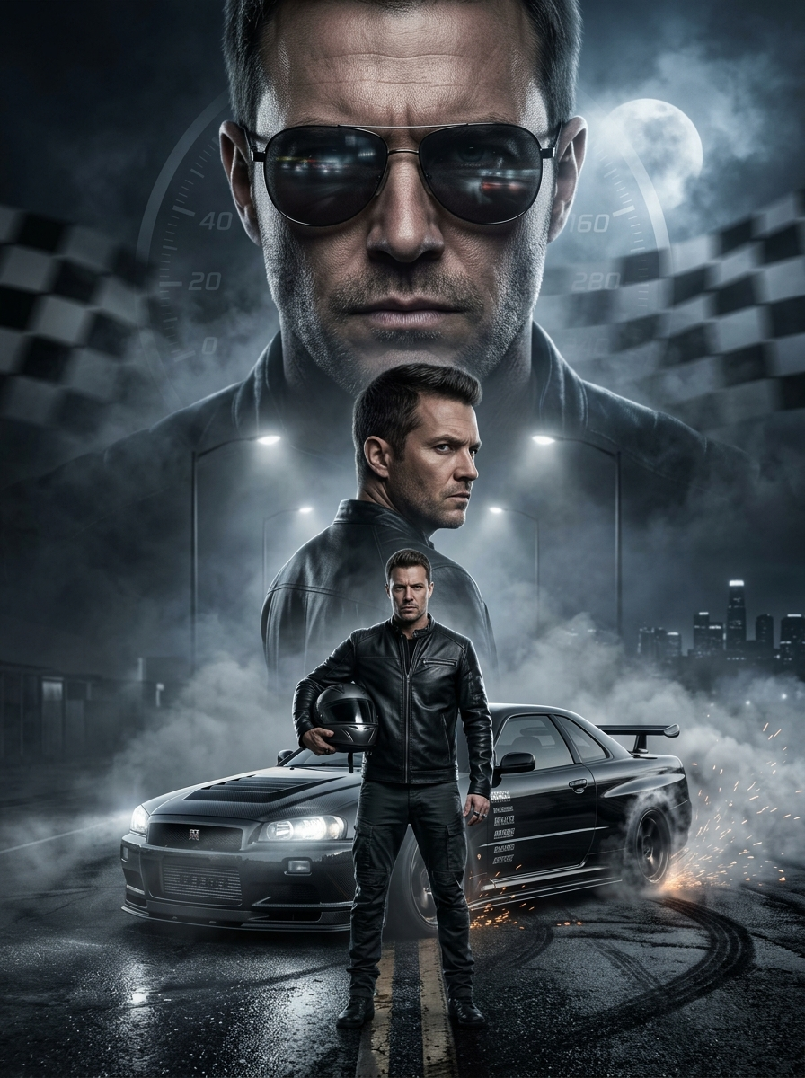 Ultra-realistic cinematic underground racing poster, with a dark, smoky and intense atmosphere inspired by nighttime street-race culture. Create a triple-layer composition: Foreground Scene (Full-body) A dramatic full-body shot of the model standing in the middle of an abandoned industri-al road at night. He should be holding a racing helmet under one arm and standing confidently beside a modified street-race car drifting in slow motion behind him, gen-erating heavy smoke, sparks, and tire marks. The ground must reflect light from the car's headlights, adding -asphalt cinematic reflections. Clothing: black jacket (leather or tactical), dark pants, rings and accessories, subtle metallic reflections, realistic fabric texture with shadows and folds. Mid-layer Portrait A medium-sized portrait of the model, facing sideways with a stern, focused expression, as if preparing for a race or confrontation. Add subtle fog around the edges and soft rim lighting from the streetlights above. The portrait must blend smoothly with the drifting smoke from the car. Hero Background Portrait (Large Face) A massive intense close-up of the model's face dominating the top of the poster, ex-pression strong and fearless. Add faint reflections of racing lights in the sunglasses and a subtle speedometer graphic overlay behind him. Smoke and moonlight should frame this portrait, creating a dramatic halo effect. Atmosphere and Effects: Dark palette with blacks, grays, metallic silver and moon-blue. Minimal neon, no colorful beams. Mist, drifting smoke, sparks from asphalt. A blurred checkered-flag motion effect behind the background portrait. Soft city skyline silhouette far behind the smoke. Car: A completely different model from the previous prompt: Nissan GT-R Black Edition (or similar JDM icon), hyper-detailed with glossy reflections, racing decals, car-bon-fiber textures, and headlights slicing through fog. Face Replacement Instruction: Replace all faces with the face from the photo I will upload. Keep lighting, expression, angle, texture and realism consistent with the cinematic scene. Do not alter the per-son's natural facial features. Blend the face perfectly into the poster. Final Rendering Style: 8K resolution, ultra-sharp details, premium Hollywood poster composition, dramatic depth of field, misty environment, crisp reflections, slight vignette, full photorealism.