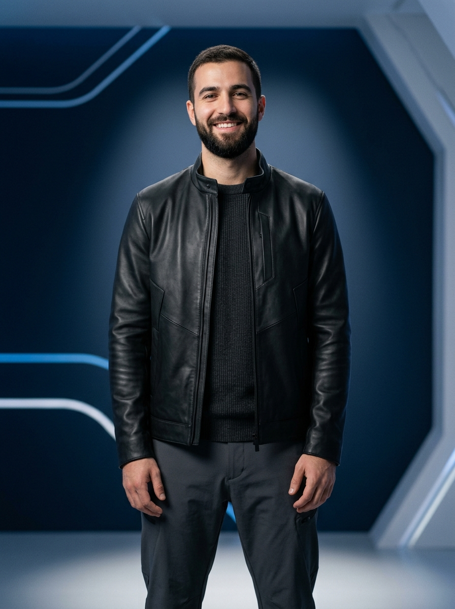 Ultra-realistic futuristic studio photoshoot of a model (same face and proportions as reference). Minimal cinematic lighting, spotlight subtly centered on him, with smooth falloff and soft shadows. Background is deep dark blue, clean and modern. The model is smiling confidently, natural expression, relaxed posture. He wears futuristic casual clothing layered with a sleek black leather jacket, refined textures, hidden seams, subtle tech-inspired details. High-end photography style, crisp focus on subject, shallow depth of field, premium fashion editorial vibe, sharp details, 4k, professional color grading.