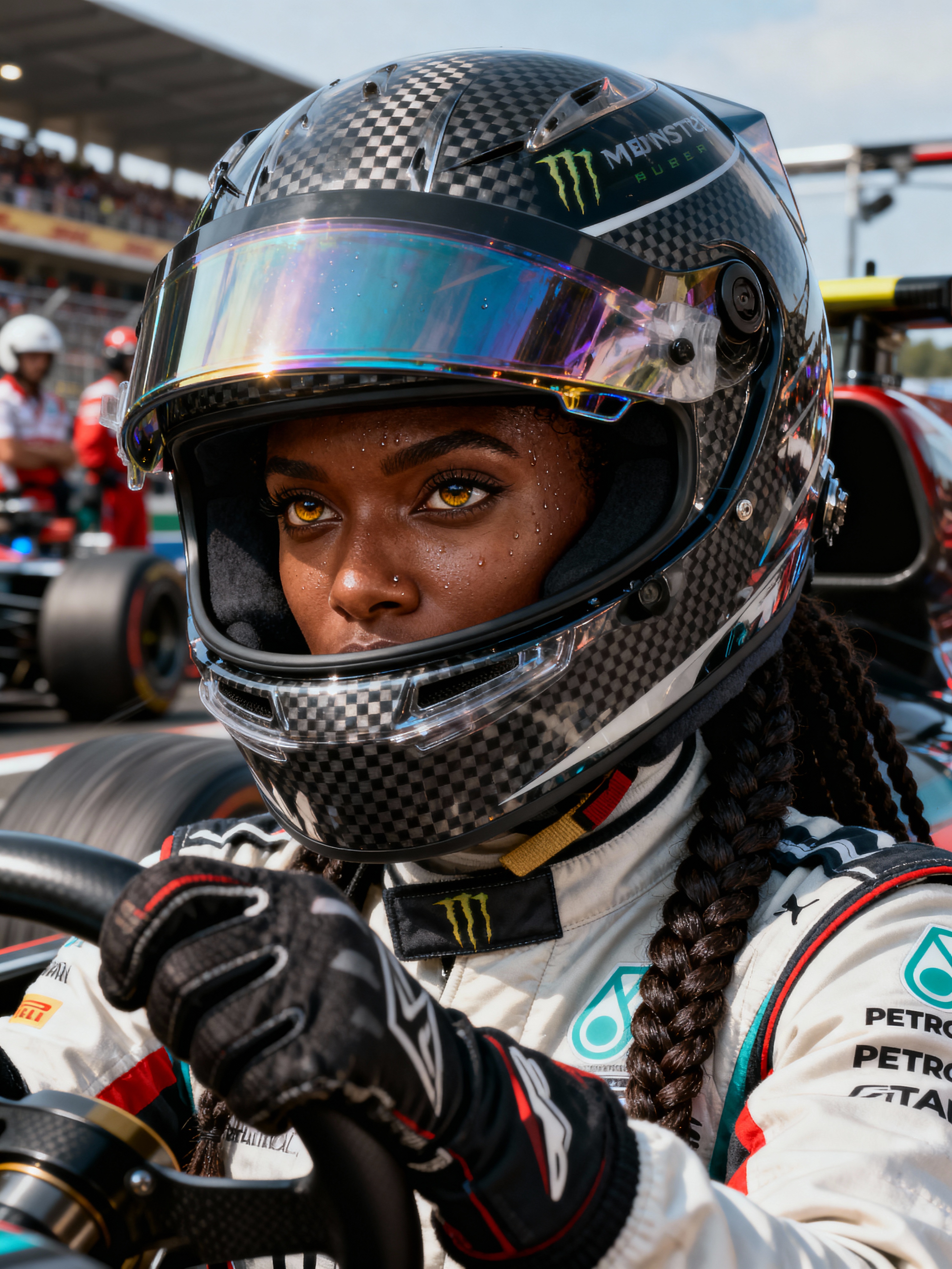 Ultra realistic photograph of model as Formula 1 race driver