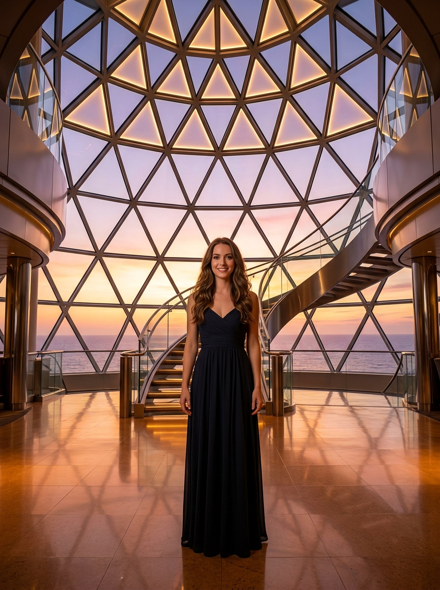 Ultra-realistic V6 realism portrait of an adult model with long wavy brown hair, sharp refined facial features, full natural lips, and flawless glowing skin. She is standing confidently in a luxurious futuristic cruise-ship atrium during golden hour. The space features an immense geometric glass dome ceiling composed of illuminated triangular panels, casting warm amber reflections across polished metallic surfaces. Through the dome, a serene ocean horizon is , washed in sunset tones of gold, pink, and soft violet. The atmosphere is elegant, cinematic, and high-end, with subtle depth-of-field, photorealistic lighting, intricate architectural details, and a premium fashion aesthetic.