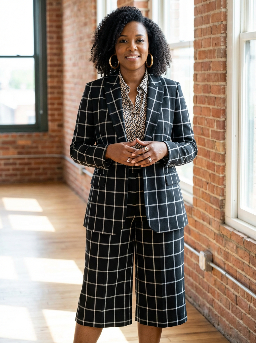 unique and striking model showcasing a windowpane check blazer with coordinating culottes, patterned blouse and statement earrings