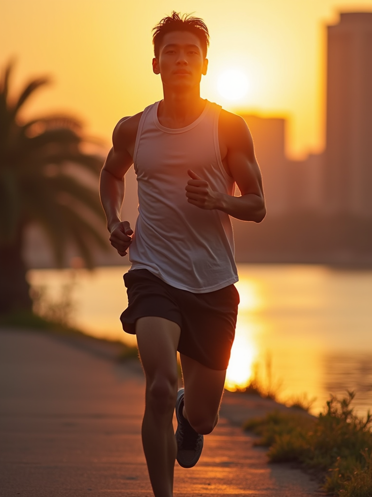 upbeat masculine model jogging along a riverside path at sunrise