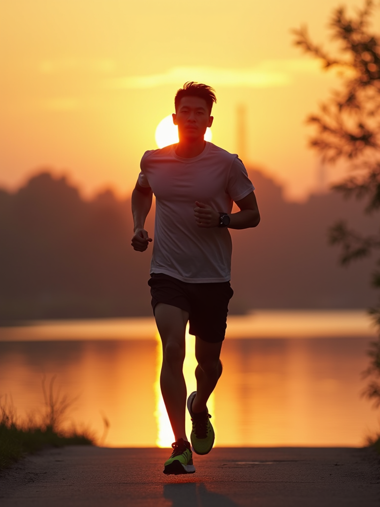 upbeat masculine model jogging along a riverside path at sunrise