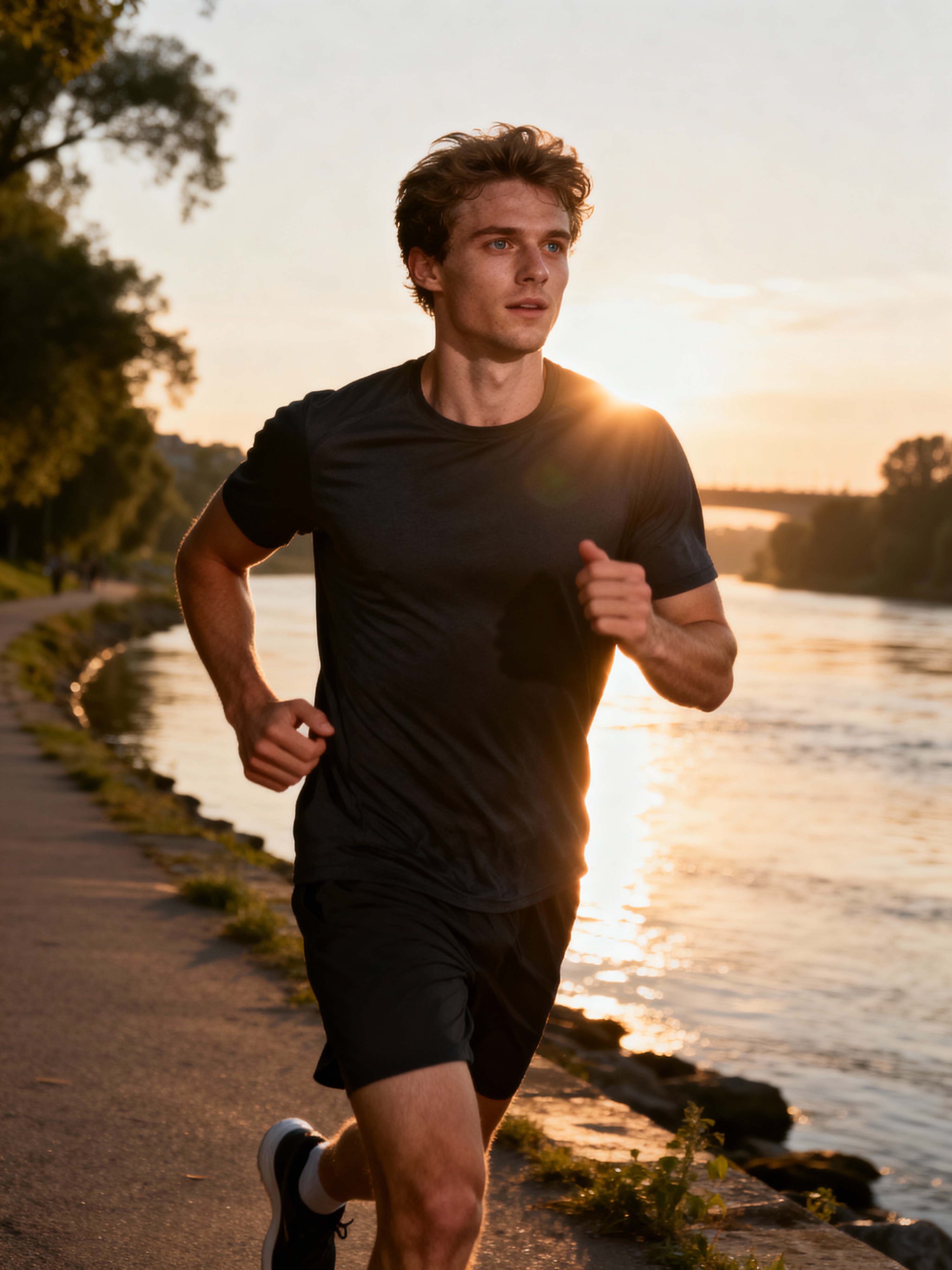 upbeat masculine model jogging along a riverside path at sunrise
