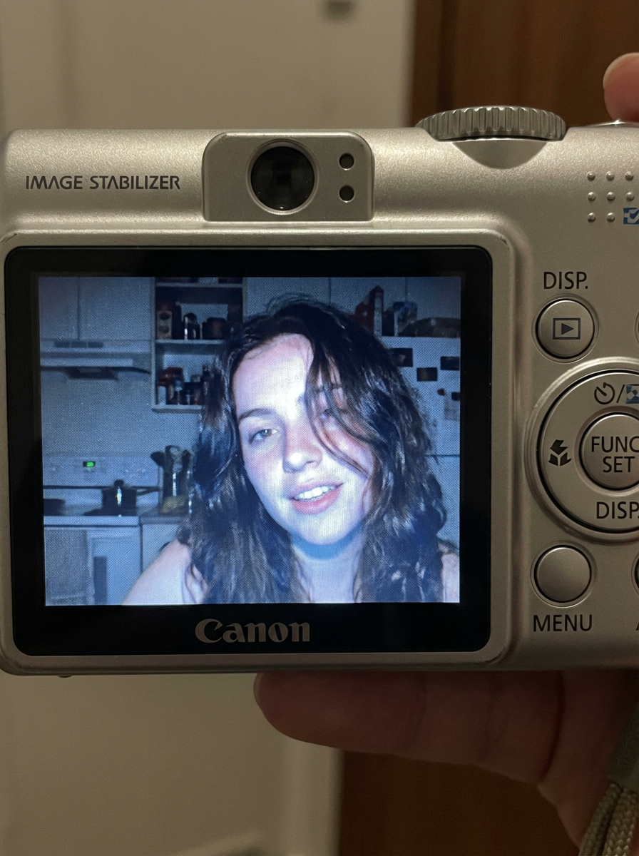 Use facial feature of attached photo. A close-up shot of a young model displayed on the screen of a compact Canon digital camera. The camera body surrounds the image with its buttons, dials, and textured surface visible, including the FUNC/SET wheel, DISP button, and the “IMAGE STABILIZER” label along the side. The photo on the screen shows the model indoors at night, illuminated by a bright built-in flash that creates sharp highlights on her face and hair. She has long dark hair falling across part of her face in loose strands, with a soft, slightly open-lip expression. The flash accentuates her features against a dim, cluttered kitchen background with appliances, shelves, and metallic surfaces softly blurred. The mood is candid, raw, nostalgic, and reminiscent of early 2000s digital camera snapshots. Colors are slightly muted with cool undertones, strong flash contrast, and natural grain from the display. No text, no logos inside the photo preview itself.