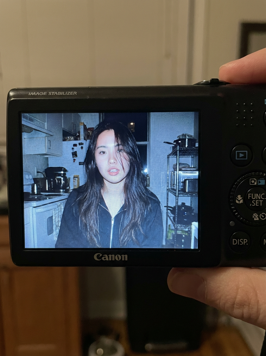 Use facial feature of attached photo. A close-up shot of a young model displayed on the screen of a compact Canon digital camera. The camera body surrounds the image with its buttons, dials, and textured surface visible, including the FUNC/SET wheel, DISP button, and the “IMAGE STABILIZER” label along the side. The photo on the screen shows the model indoors at night, illuminated by a bright built-in flash that creates sharp highlights on her face and hair. She has long dark hair falling across part of her face in loose strands, with a soft, slightly open-lip expression. The flash accentuates her features against a dim, cluttered kitchen background with appliances, shelves, and metallic surfaces softly blurred. The mood is candid, raw, nostalgic, and reminiscent of early 2000s digital camera snapshots. Colors are slightly muted with cool undertones, strong flash contrast, and natural grain from the display. No text, no logos inside the photo preview itself.