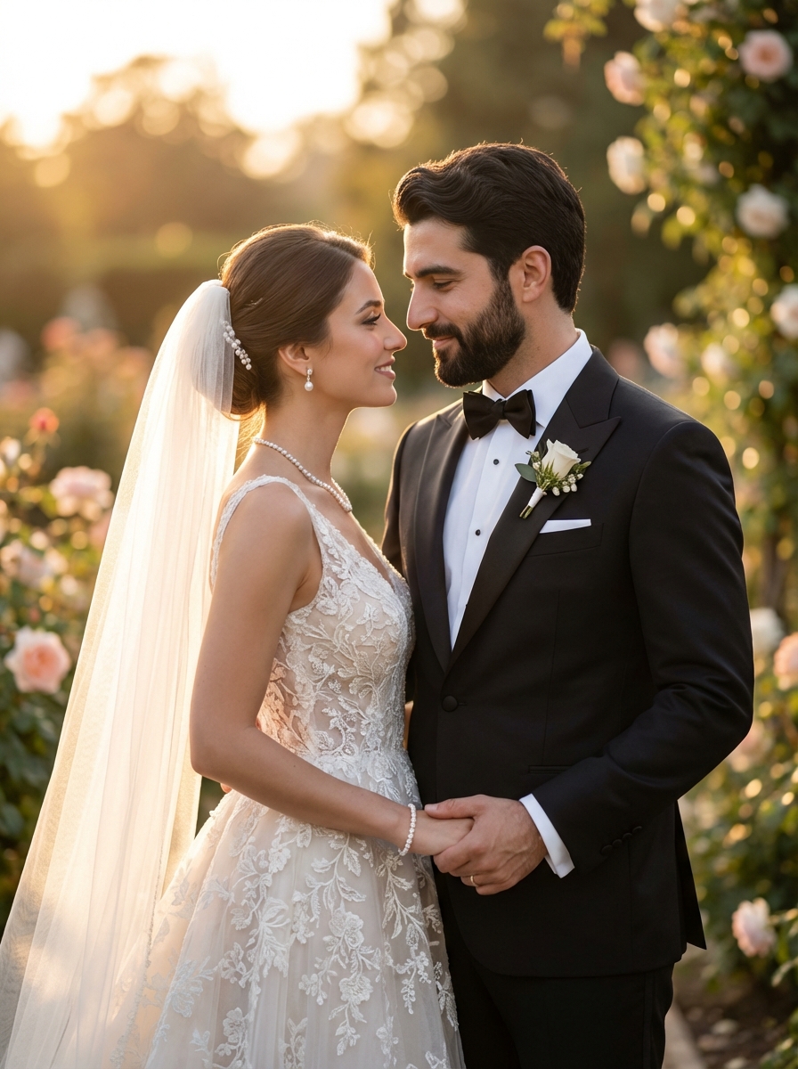 { "Use [man_face] and [woman_fac]. Ultra-realistic high-end luxury wedding photography of a bride and groom standing closely together in an elegant outdoor ceremony setting. Golden hour sunlight casting warm soft highlights, natural rim light around their silhouettes, cinematic dynamic range. The bride wearing a premium handcrafted lace wedding gown with intricate embroidery details, soft flowing veil illuminated by backlight, subtle pearl accessories, refined natural bridal makeup with luminous skin texture, finely detailed eyelashes and catchlights in eyes. The groom wearing a tailored tuxedo with satin lapels, crisp shirt, luxury bow tie, polished boutonniere. Both posing in a candid yet editorial fashion – gentle eye contact, soft romantic smile, hands touching gracefully. Background featuring a softly blurred bokeh garden with roses, organic greenery, warm tones, shallow depth of field created by an 85mm f/1.4 full-frame lens. High-definition textures, ultra sharp facial details, realistic pores, true-to-life skin tones, natural hair strands, perfect color grading inspired by premium wedding photographers. Soft pastel color palette, creamy highlights, subtle film grain, magazine cover aesthetic. Cinematic global illumination, perfect exposure balance, no distortion, no artifacts. Award-winning photography style with fine-art wedding composition, dramatic yet soft lighting, museum-quality detail clarity.", "negative_prompt": "cartoon, illustration, painting, CGI, artificial look, uncanny valley, distorted facial features, extra limbs, deformed body parts, mismatched eyes, unnatural skin texture, plastic skin, blur, noise, pixelation, low resolution, oversaturated colors, washed out colors, hard flash, harsh shadows, blown highlights, low contrast, lens distortion, fisheye, bad anatomy, extra fingers, incorrect hand shapes, watermark, text, logo, border, frame, compression artifacts, glitch, unrealistic proportions, double face, duplicate subjects, warped background", "camera_settings": { "lens": "85mm f/1.4 prime", "iso": 100, "shutter_speed": "1/400", "aperture": "f/1.4", "white_balance": "5200K daylight" }, "style": { "lighting": "soft natural golden hour, cinematic rim light, high dynamic range", "color_grade": "premium wedding film look, pastel tones, creamy highlights, warm undertones", "atmosphere": "romantic, elegant, fine-art editorial" }, "composition": { "framing": "mid-shot portrait, slight angle, bride and groom centered", "focus": "sharp eyes, smooth bokeh background", "depth_of_field": "shallow, subject separation emphasized" }, "width": 1024, "height": 1536, "num_inference_steps": 36, "guidance_scale": 8.0, "seed": 12345 }