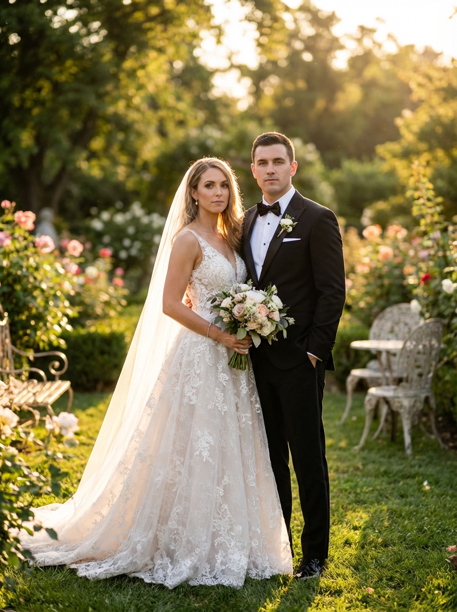 { "Use [man_face] and [woman_fac]. Ultra-realistic high-end luxury wedding photography of a bride and groom standing closely together in an elegant outdoor ceremony setting. Golden hour sunlight casting warm soft highlights, natural rim light around their silhouettes, cinematic dynamic range. The bride wearing a premium handcrafted lace wedding gown with intricate embroidery details, soft flowing veil illuminated by backlight, subtle pearl accessories, refined natural bridal makeup with luminous skin texture, finely detailed eyelashes and catchlights in eyes. The groom wearing a tailored tuxedo with satin lapels, crisp shirt, luxury bow tie, polished boutonniere. Both posing in a candid yet editorial fashion – gentle eye contact, soft romantic smile, hands touching gracefully. Background featuring a softly blurred bokeh garden with roses, organic greenery, warm tones, shallow depth of field created by an 85mm f/1.4 full-frame lens. High-definition textures, ultra sharp facial details, realistic pores, true-to-life skin tones, natural hair strands, perfect color grading inspired by premium wedding photographers. Soft pastel color palette, creamy highlights, subtle film grain, magazine cover aesthetic. Cinematic global illumination, perfect exposure balance, no distortion, no artifacts. Award-winning photography style with fine-art wedding composition, dramatic yet soft lighting, museum-quality detail clarity.", "negative_prompt": "cartoon, illustration, painting, CGI, artificial look, uncanny valley, distorted facial features, extra limbs, deformed body parts, mismatched eyes, unnatural skin texture, plastic skin, blur, noise, pixelation, low resolution, oversaturated colors, washed out colors, hard flash, harsh shadows, blown highlights, low contrast, lens distortion, fisheye, bad anatomy, extra fingers, incorrect hand shapes, watermark, text, logo, border, frame, compression artifacts, glitch, unrealistic proportions, double face, duplicate subjects, warped background", "camera_settings": { "lens": "85mm f/1.4 prime", "iso": 100, "shutter_speed": "1/400", "aperture": "f/1.4", "white_balance": "5200K daylight" }, "style": { "lighting": "soft natural golden hour, cinematic rim light, high dynamic range", "color_grade": "premium wedding film look, pastel tones, creamy highlights, warm undertones", "atmosphere": "romantic, elegant, fine-art editorial" }, "composition": { "framing": "mid-shot portrait, slight angle, bride and groom centered", "focus": "sharp eyes, smooth bokeh background", "depth_of_field": "shallow, subject separation emphasized" }, "width": 1024, "height": 1536, "num_inference_steps": 36, "guidance_scale": 8.0, "seed": 12345 }