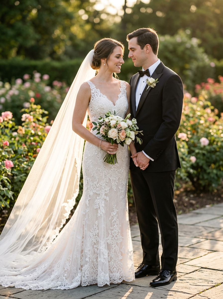 { "Use [man_face] and [woman_fac]. Ultra-realistic high-end luxury wedding photography of a bride and groom standing closely together in an elegant outdoor ceremony setting. Golden hour sunlight casting warm soft highlights, natural rim light around their silhouettes, cinematic dynamic range. The bride wearing a premium handcrafted lace wedding gown with intricate embroidery details, soft flowing veil illuminated by backlight, subtle pearl accessories, refined natural bridal makeup with luminous skin texture, finely detailed eyelashes and catchlights in eyes. The groom wearing a tailored tuxedo with satin lapels, crisp shirt, luxury bow tie, polished boutonniere. Both posing in a candid yet editorial fashion – gentle eye contact, soft romantic smile, hands touching gracefully. Background featuring a softly blurred bokeh garden with roses, organic greenery, warm tones, shallow depth of field created by an 85mm f/1.4 full-frame lens. High-definition textures, ultra sharp facial details, realistic pores, true-to-life skin tones, natural hair strands, perfect color grading inspired by premium wedding photographers. Soft pastel color palette, creamy highlights, subtle film grain, magazine cover aesthetic. Cinematic global illumination, perfect exposure balance, no distortion, no artifacts. Award-winning photography style with fine-art wedding composition, dramatic yet soft lighting, museum-quality detail clarity.", "negative_prompt": "cartoon, illustration, painting, CGI, artificial look, uncanny valley, distorted facial features, extra limbs, deformed body parts, mismatched eyes, unnatural skin texture, plastic skin, blur, noise, pixelation, low resolution, oversaturated colors, washed out colors, hard flash, harsh shadows, blown highlights, low contrast, lens distortion, fisheye, bad anatomy, extra fingers, incorrect hand shapes, watermark, text, logo, border, frame, compression artifacts, glitch, unrealistic proportions, double face, duplicate subjects, warped background", "camera_settings": { "lens": "85mm f/1.4 prime", "iso": 100, "shutter_speed": "1/400", "aperture": "f/1.4", "white_balance": "5200K daylight" }, "style": { "lighting": "soft natural golden hour, cinematic rim light, high dynamic range", "color_grade": "premium wedding film look, pastel tones, creamy highlights, warm undertones", "atmosphere": "romantic, elegant, fine-art editorial" }, "composition": { "framing": "mid-shot portrait, slight angle, bride and groom centered", "focus": "sharp eyes, smooth bokeh background", "depth_of_field": "shallow, subject separation emphasized" }, "width": 1024, "height": 1536, "num_inference_steps": 36, "guidance_scale": 8.0, "seed": 12345 }