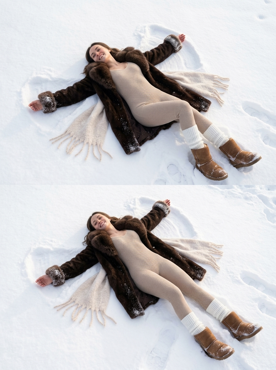 Use the uploaded reference image to preserve the original facial features and natural body proportions with strict identity consistency. A high-quality, ultra-realistic winter fashion photograph of a young model lying on her back in deep, fresh snow, arms and legs spread wide as if she has just made a snow angel. She is smiling joyfully, with a genuine, spontaneous expression — relaxed, playful, and fully human. She wears a form-fitting beige ribbed knit jumpsuit, naturally following the bodywithout distortion. Over it, an open dark brown fur coat with a fluffy, voluminous collar and soft fur cuffs, slightly dusted with snow. On her legs are white knitted leg warmers or scrunched socks, worn over the jumpsuit, paired with cozy brown fur boots / ugg-style boots, visibly textured and lightly covered in snow. Around her shoulders and partially spread in the snow is a light, fluffy scarf or throw with soft fringe, adding movement and warmth to the composition.The scene takes place on a bright, sunny winter day. The snow is clean, bright white, with impressions, footprints, and subtle compression around her body. Sunlight creates gentle highlights and soft natural shadows, with realistic light bounce from the snow onto the skin and clothing. Camera angle is top-side view, slightly diagonal, giving depth and a candid editorial feel.Shot like professional fashion photography: natural anatomy, realistic skin texture (pores, micro-imperfections), accurate fabric weave, true fur texture, no artificial smoothing. Cozy yet playful winter fashion aesthetic, authentic outdoor lighting, high optical sharpness, shallow depth of field, editorial realism — no CGI look, no stylization, no exaggerated beauty.