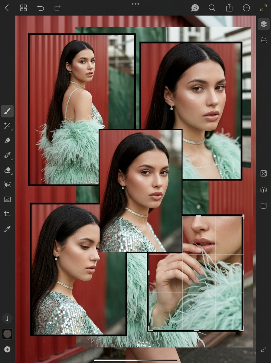 Use this photo attached to create a high-fashion editorial collage displayed inside a tablet or iPad-like interface, as if viewed within a design or photo-editing app. The canvas shows a multi-frame fashion collage featuring the same hyper-realistic young model, arranged in overlapping rectangular image panels. The collage appears actively being edited, with UI elements and icons around the edges. Subject & Styling Hyper-realistic young model with long dark hair, center-parted, smooth and glossy Luminous skin with natural highlights and texture Soft glam makeup: glossy lips, subtle blush, reflective cheekbones Wearing a sparkling sequined top and mint-green feathered stole Minimal jewelry: thin choker necklace, small earrings Collage Frames Multiple cropped portraits layered together Different poses: side glance, over-the-shoulder look, hand near lips holding feathers Frames vary in size and orientation, like a designer mood board Thin borders around each image panel Backgrounds Red corrugated