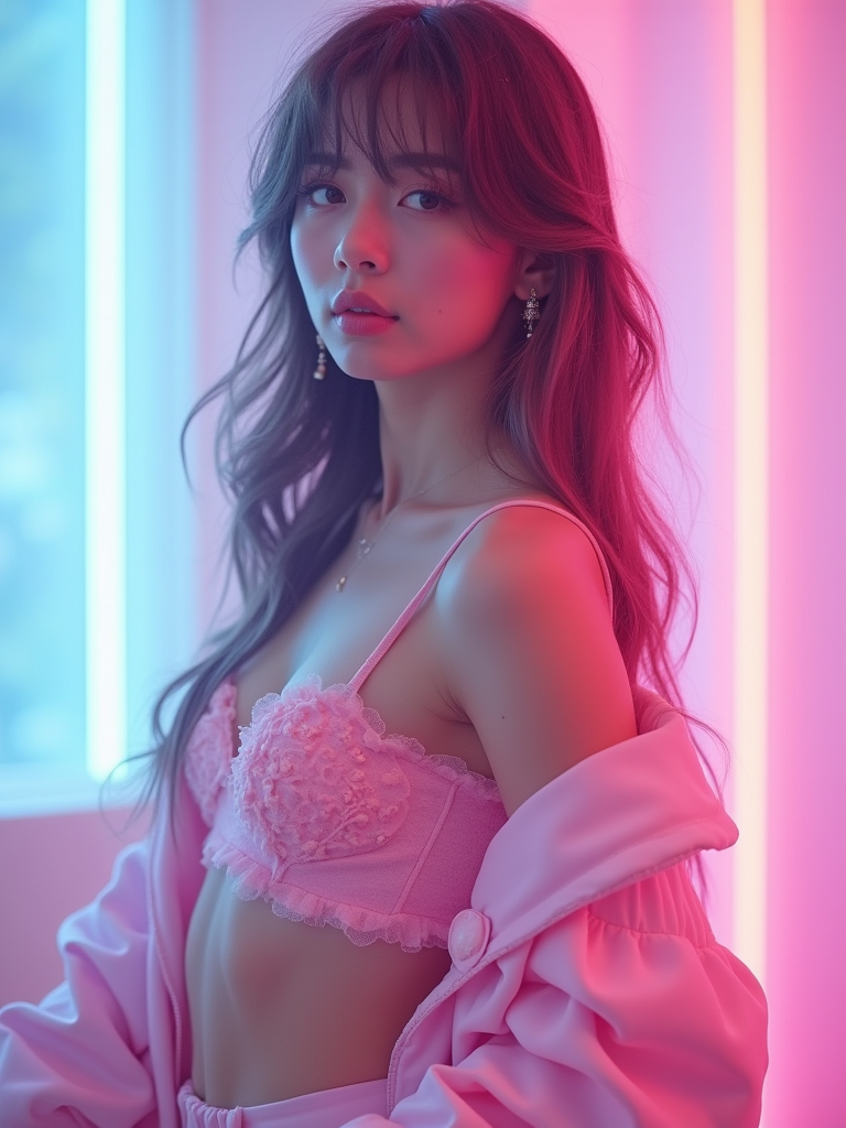 Vaporwave E-Girl aesthetic, dreamy lighting, soft neon glow. Wearing a pastel aesthetic outfit, subtle anime influence . Soft dreamy effect.