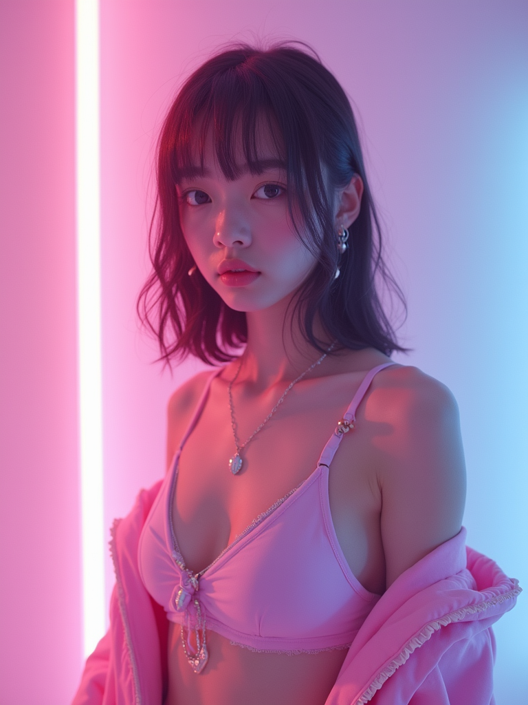 Vaporwave E-Girl aesthetic, dreamy lighting, soft neon glow. Wearing a pastel aesthetic outfit, subtle anime influence . Soft dreamy effect.