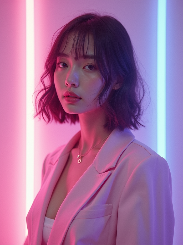 Vaporwave E-Girl aesthetic, dreamy lighting, soft neon glow. Wearing a pastel aesthetic outfit, subtle anime influence . Soft dreamy effect.