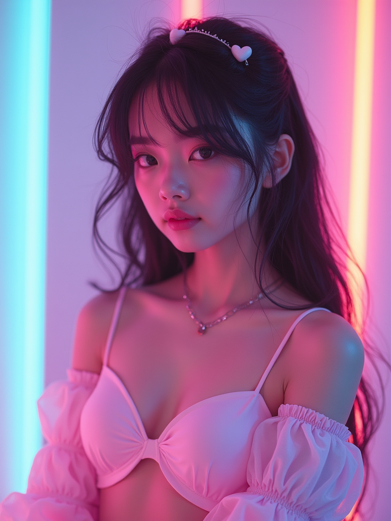 Vaporwave E-Girl aesthetic, dreamy lighting, soft neon glow. Wearing a pastel aesthetic outfit, subtle anime influence . Soft dreamy effect.