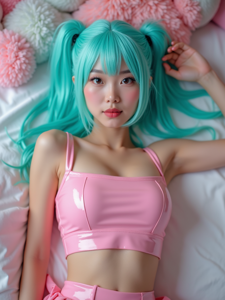 Vibrant cosplay scene of model dressed as a flirty anime character, featuring a bright turquoise wig and a tight pink glossy crop top. She lies on white sheets with a sultry expression, surrounded by plushies and scattered pastel accessories. The soft bedroom lighting creates a dreamy, intimate glow, perfect for a playful anime aesthetic.