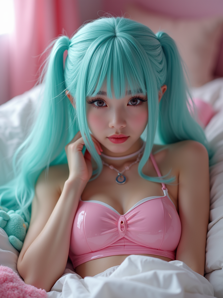 Vibrant cosplay scene of model dressed as a flirty anime character, featuring a bright turquoise wig and a tight pink glossy crop top. She lies on white sheets with a sultry expression, surrounded by plushies and scattered pastel accessories. The soft bedroom lighting creates a dreamy, intimate glow, perfect for a playful anime aesthetic.