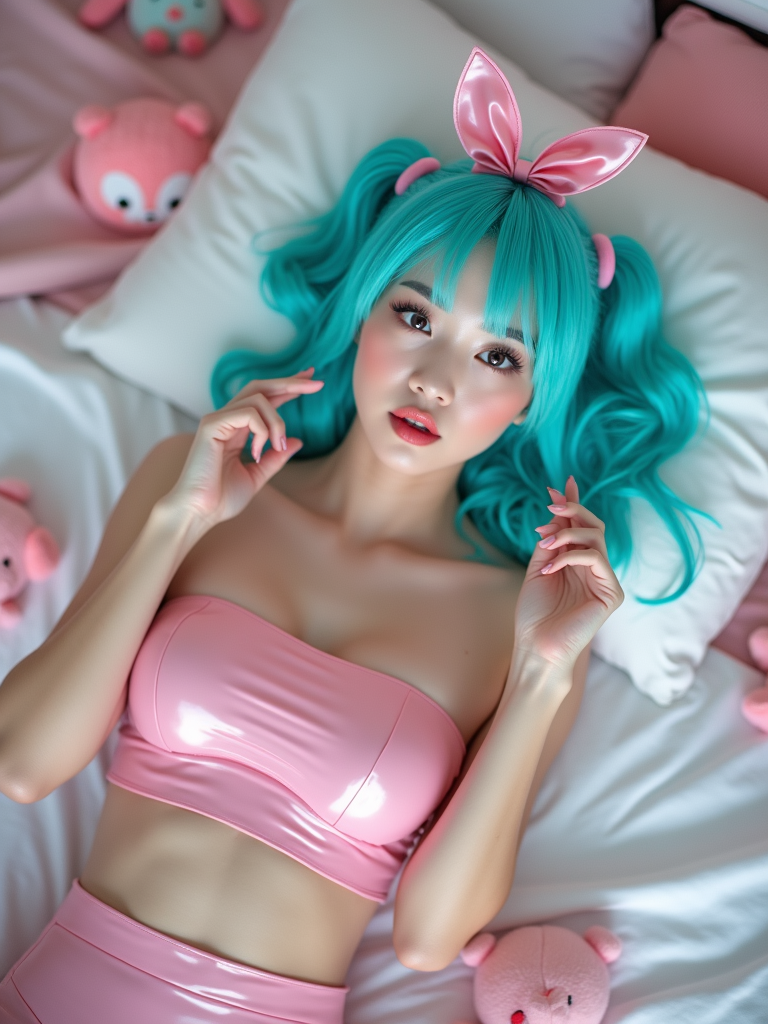 Vibrant cosplay scene of model dressed as a flirty anime character, featuring a bright turquoise wig and a tight pink glossy crop top. She lies on white sheets with a sultry expression, surrounded by plushies and scattered pastel accessories. The soft bedroom lighting creates a dreamy, intimate glow, perfect for a playful anime aesthetic.