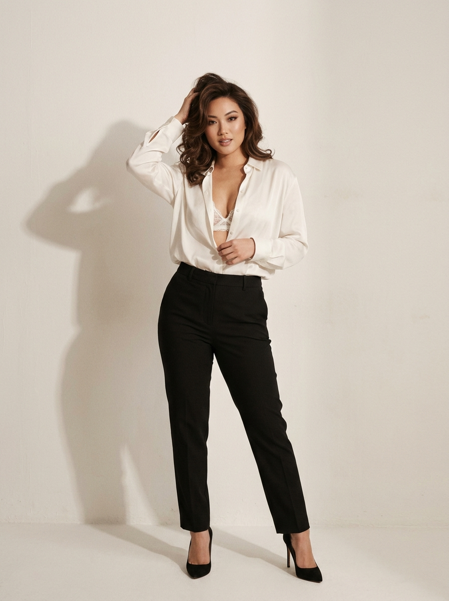 Victoria's Secret model in fitted white silk blouse unbuttoned , gazing seductively at camera while a shadowy figure admires from behind, minimalist white studio, soft diffused lighting, medium shot emphasizing curves, glamorous hair and makeup, confident posture, high-end lingerie campaign vibe., large