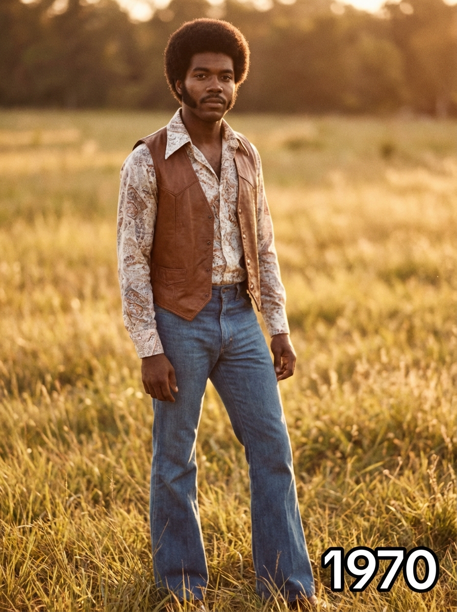 Vintage 1970s portrait of model with longer styled hair with sideburns, wearing a wide-collared shirt with flared jeans and leather vest, standing in a sunlit field with golden hour lighting, shot on vintage film with warm sepia tones and soft focus, text overlay in bottom corner reading "1970" in white sans serif font with black outline