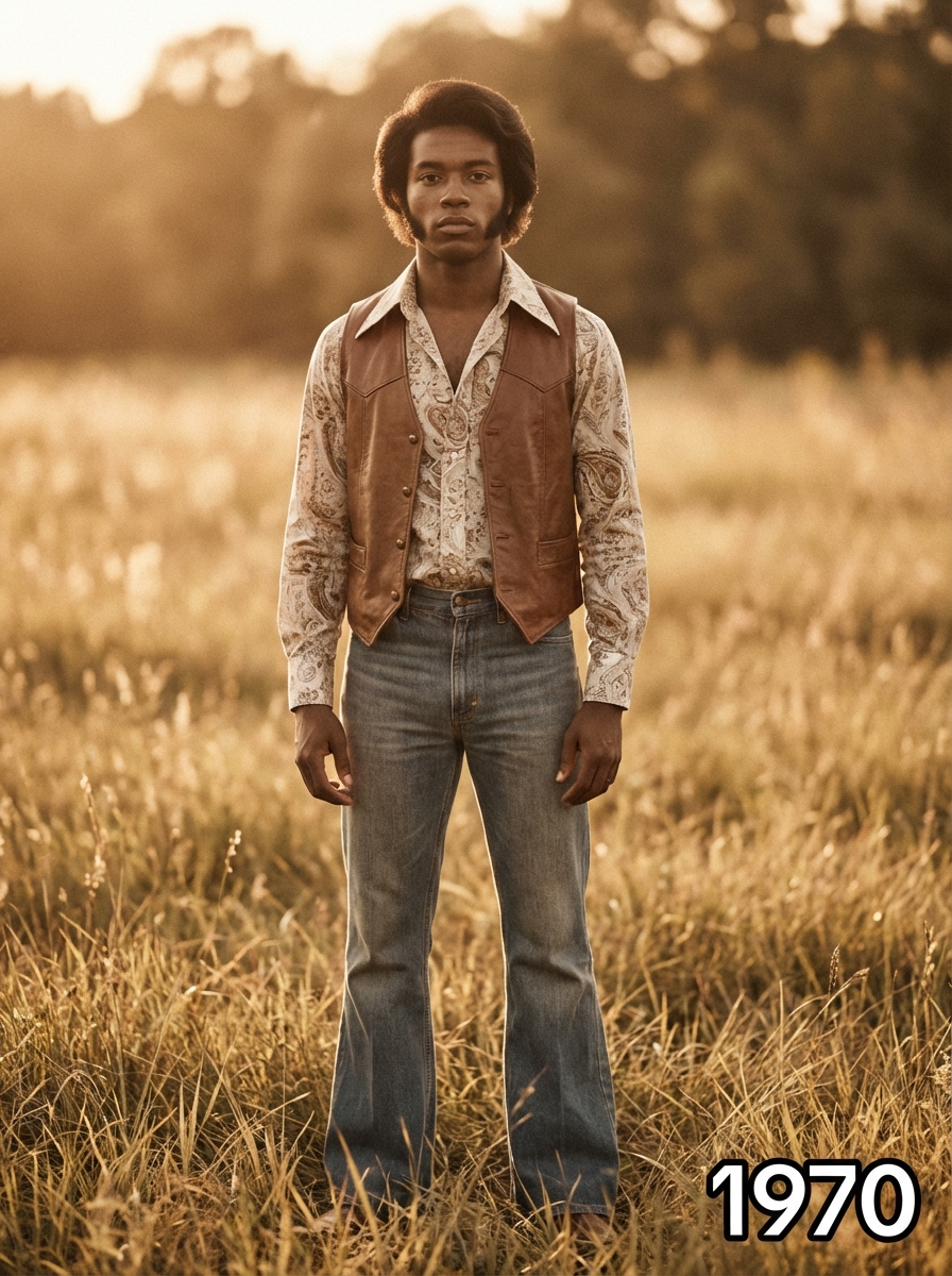 Vintage 1970s portrait of model with longer styled hair with sideburns, wearing a wide-collared shirt with flared jeans and leather vest, standing in a sunlit field with golden hour lighting, shot on vintage film with warm sepia tones and soft focus, text overlay in bottom corner reading "1970" in white sans serif font with black outline