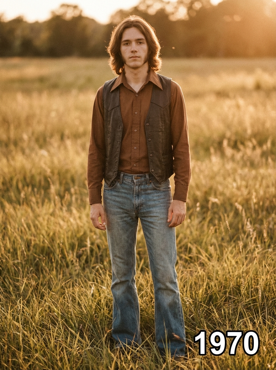 Vintage 1970s portrait of model with longer styled hair with sideburns, wearing a wide-collared shirt with flared jeans and leather vest, standing in a sunlit field with golden hour lighting, shot on vintage film with warm sepia tones and soft focus, text overlay in bottom corner reading "1970" in white sans serif font with black outline