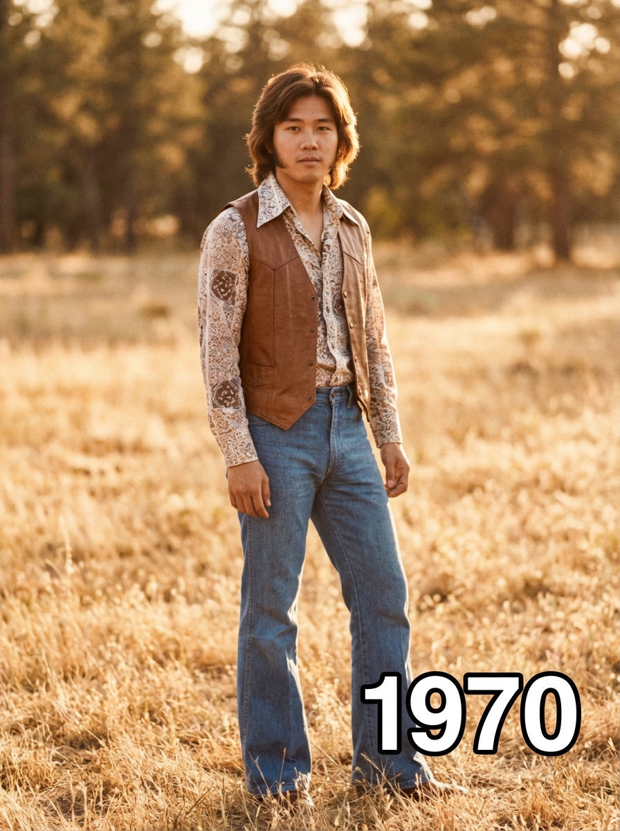 Vintage 1970s portrait of model with longer styled hair with sideburns, wearing a wide-collared shirt with flared jeans and leather vest, standing in a sunlit field with golden hour lighting, shot on vintage film with warm sepia tones and soft focus, text overlay in bottom corner reading "1970" in white sans serif font with black outline