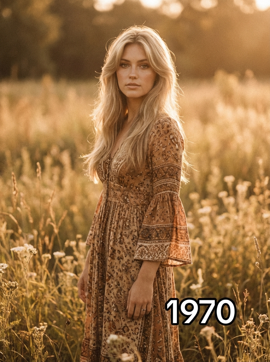 Vintage 1970s portrait of model with long feathered hair and natural makeup , wearing a flowing bohemian maxi dress with bell sleeves in earth tones , standing in a sunlit field with golden hour lighting, shot on vintage film with warm sepia tones and soft focus, text overlay in bottom corner reading "1970" in white sans serif font with black outline