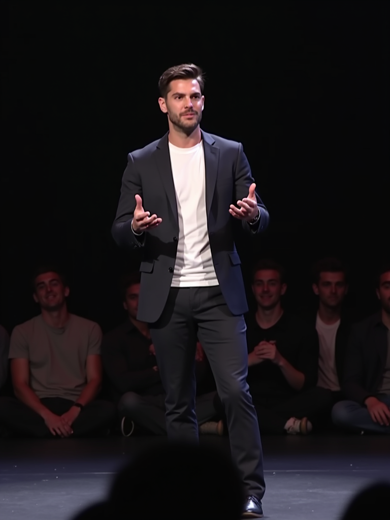 visionary model dressed in sleek blazer over t-shirt giving a TED-style presentation, minimalist stage, engaged audience, dynamic pose