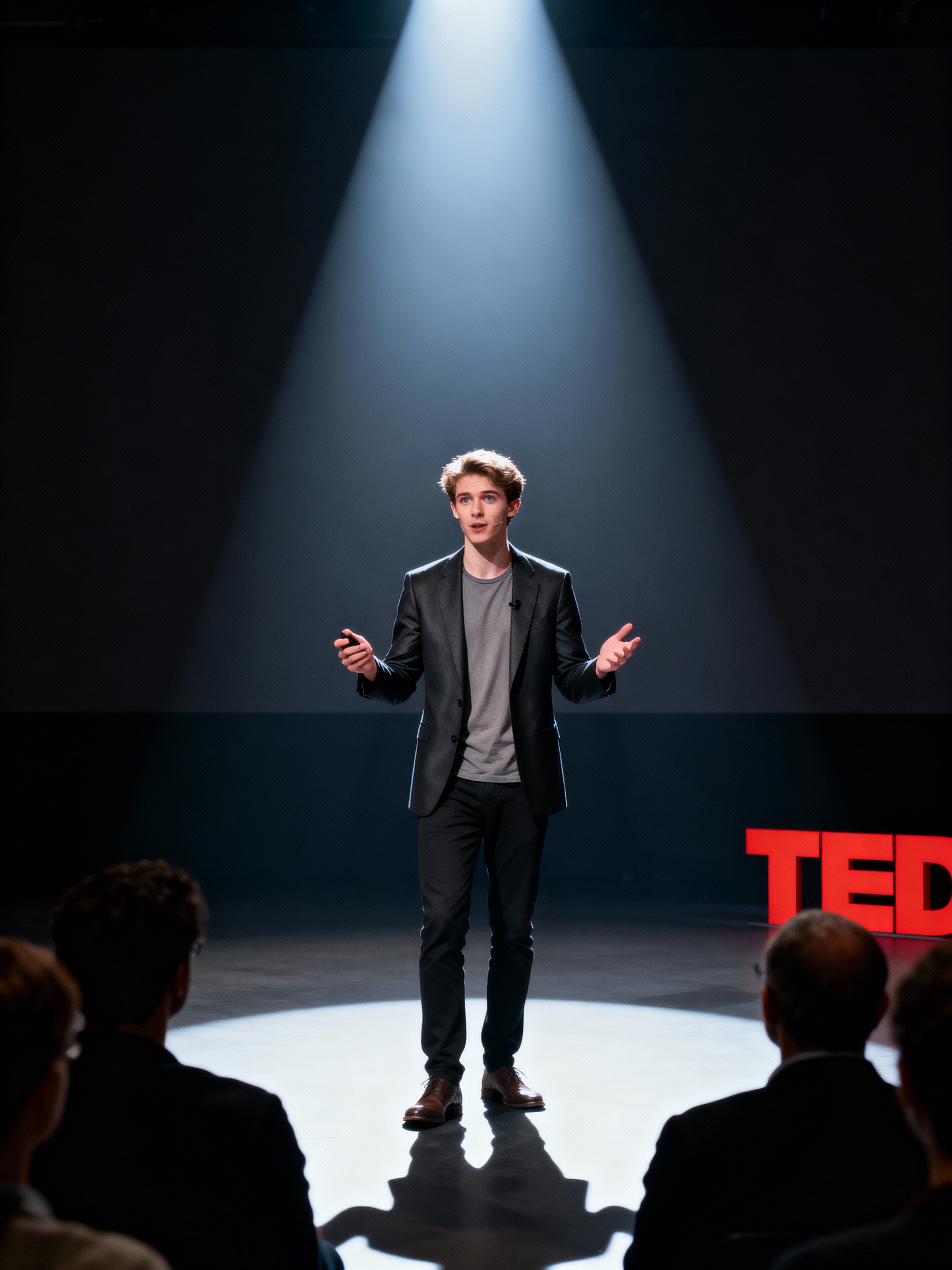 visionary model dressed in sleek blazer over t-shirt giving a TED-style presentation, minimalist stage, engaged audience, dynamic pose