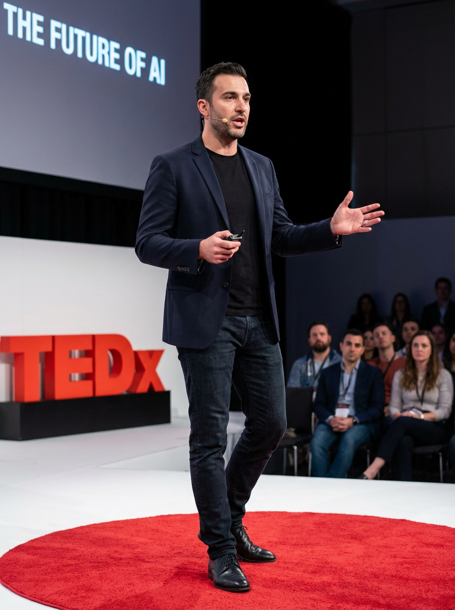 visionary model dressed in sleek blazer over t-shirt giving a TED-style presentation, minimalist stage, engaged audience, dynamic pose