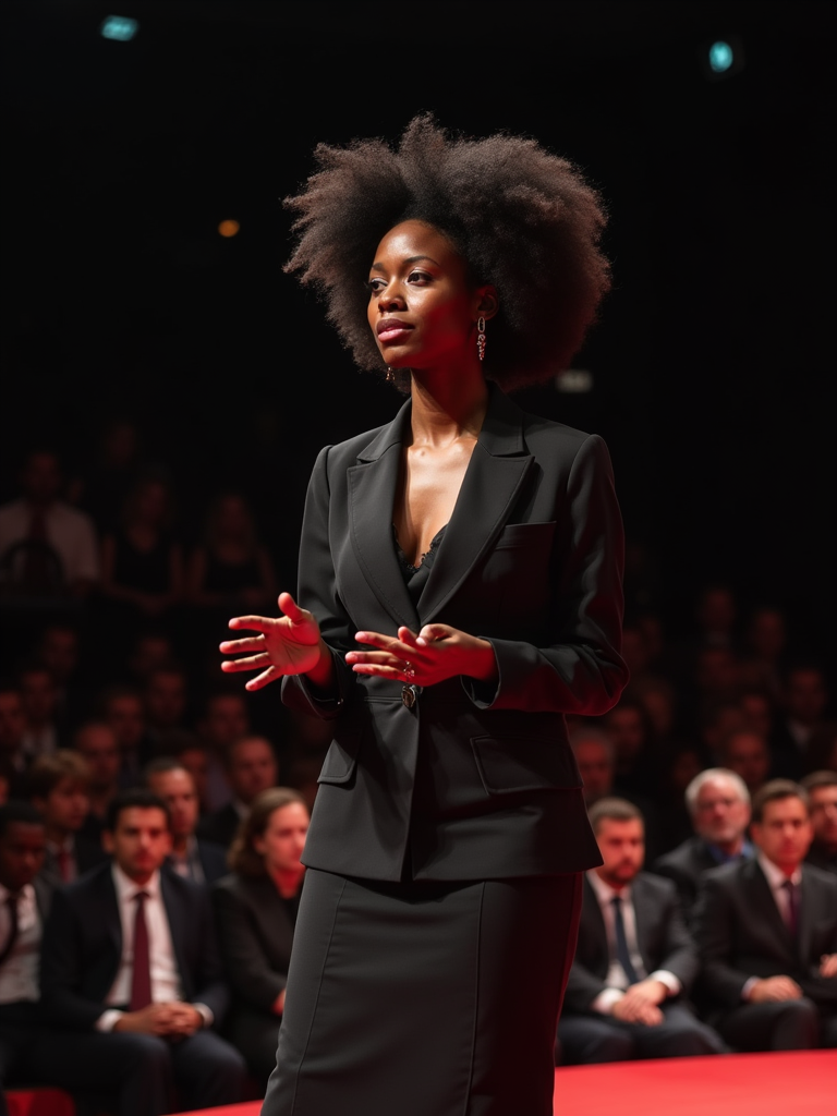 visionary model dressed in professional dress with minimal accessories giving a TED-style presentation, minimalist stage, engaged audience, dynamic pose