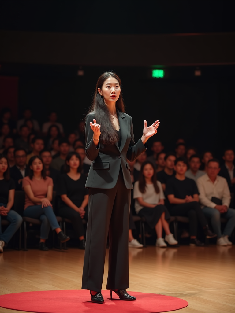 visionary model dressed in professional dress with minimal accessories giving a TED-style presentation, minimalist stage, engaged audience, dynamic pose