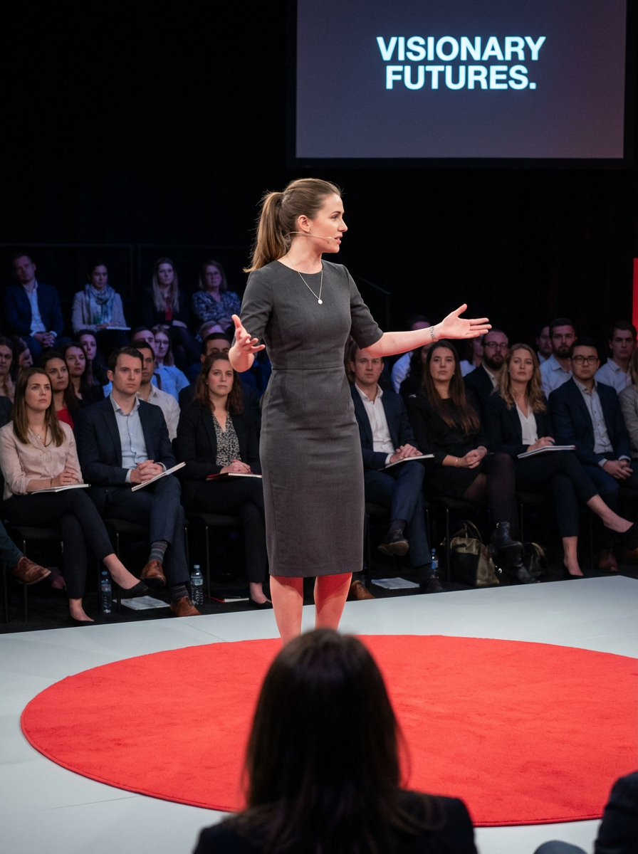 visionary model dressed in professional dress with minimal accessories giving a TED-style presentation, minimalist stage, engaged audience, dynamic pose